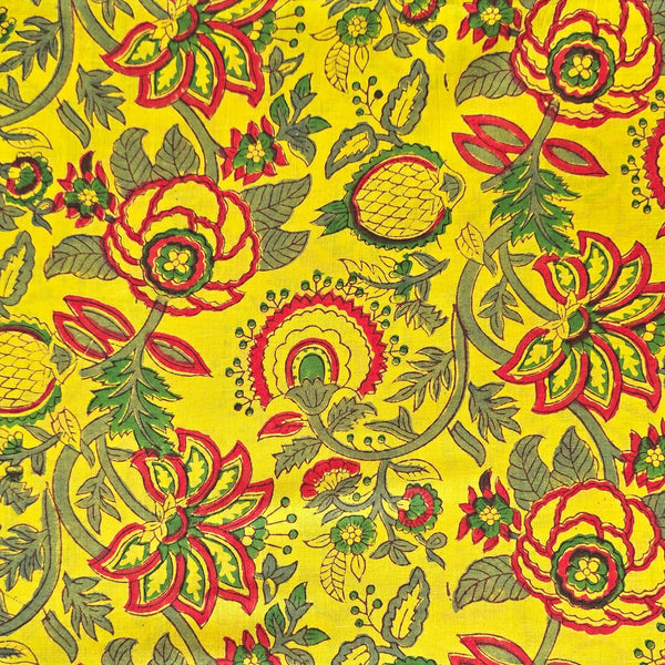 Pure Cotton Yellow With Peach Floral Design Hand Block Print Fabric