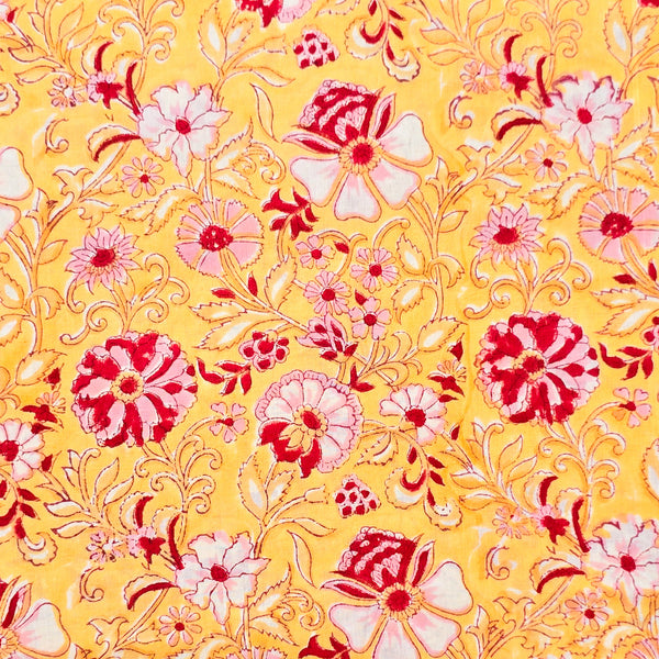 Pure Cotton Jaipuri Yellow With Pink Flower Creeper Hand Block Print Fabric