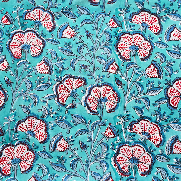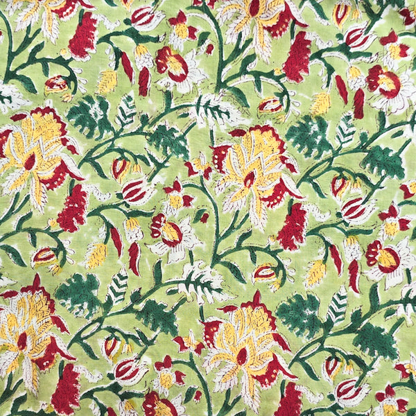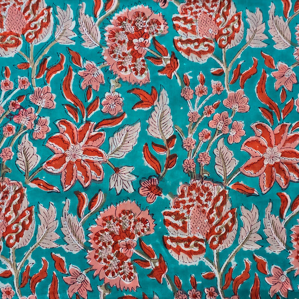 Pure Cotton Jaipuri Green With Red Flower Jaal Hand Block Print Fabric