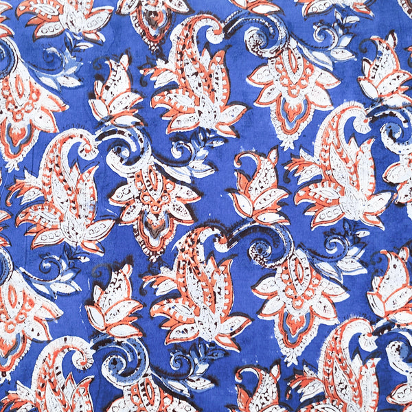 Pure Cotton Jaipuri Blue With Orange Flower Hand Block Print Fabric