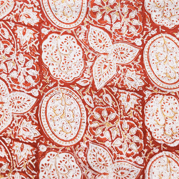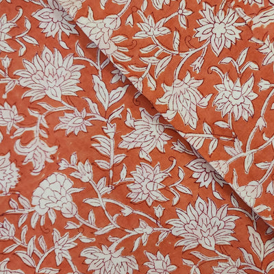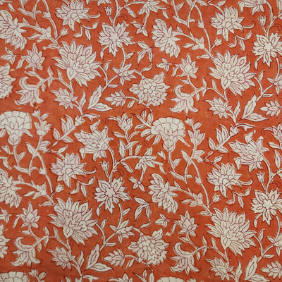 Pure Cotton Red Orange With Floral Design Hand Block Print Fabric