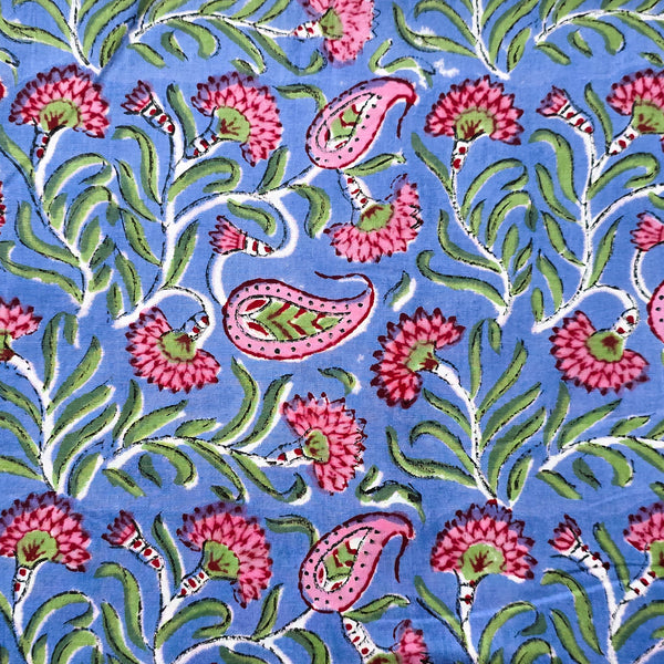 Pure Cotton Light Blue With Pink Flower Creeper Hand Block Print Fabric