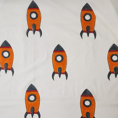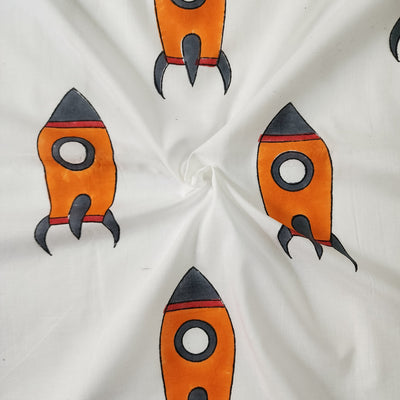Pure Cotton White With Orange Flower Motif Hand Block Print Fabric
