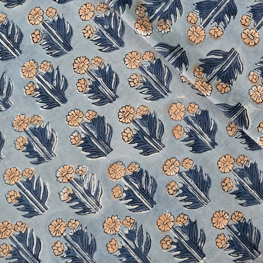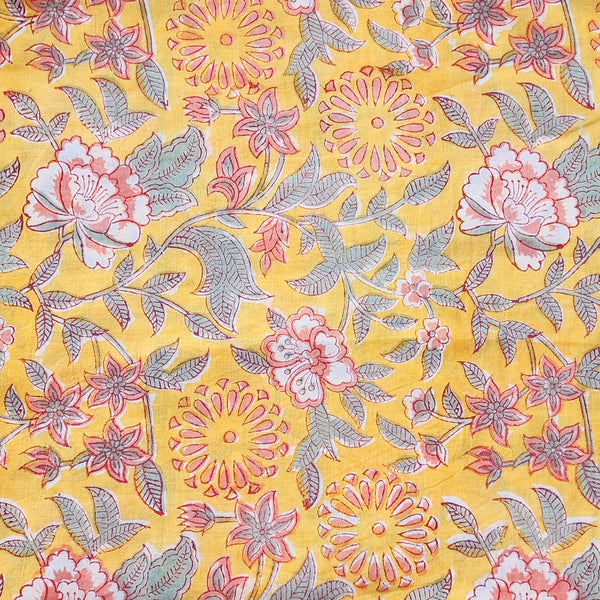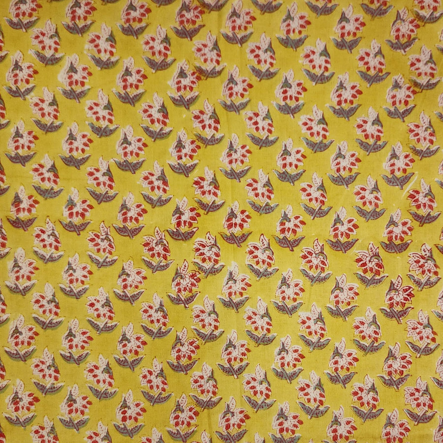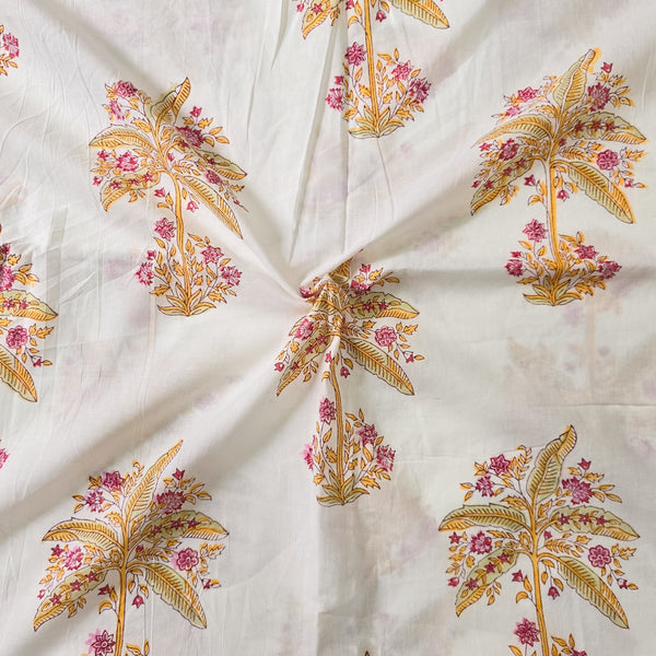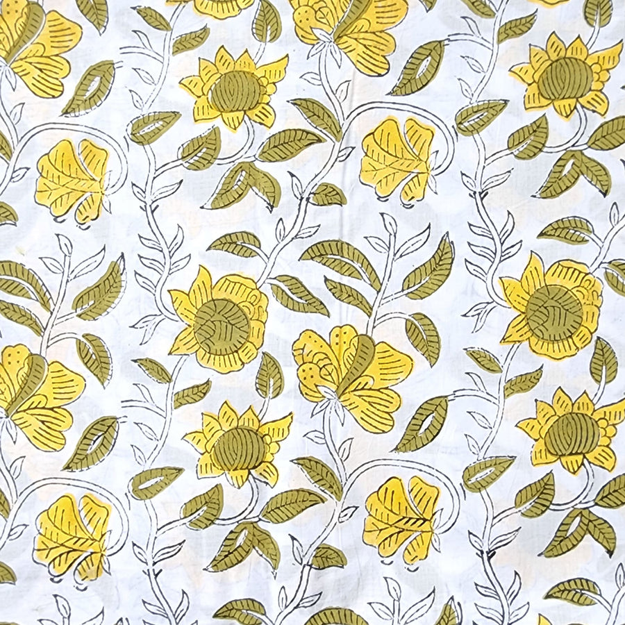 Pure Cotton Jaipuri White With Yellow Floral Hand Block Print Fabric