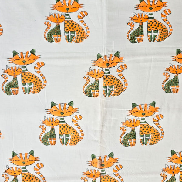 Pure Cotton Jaipuri White With Fluorescent Orange Dinosaur Motif Hand Block Print Fabric