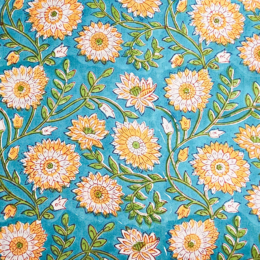 Pure Cotton Jaipuri Teal With Orange Flower Jaal Hand Block Print Fabric