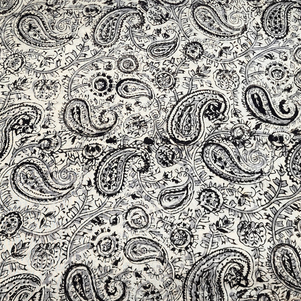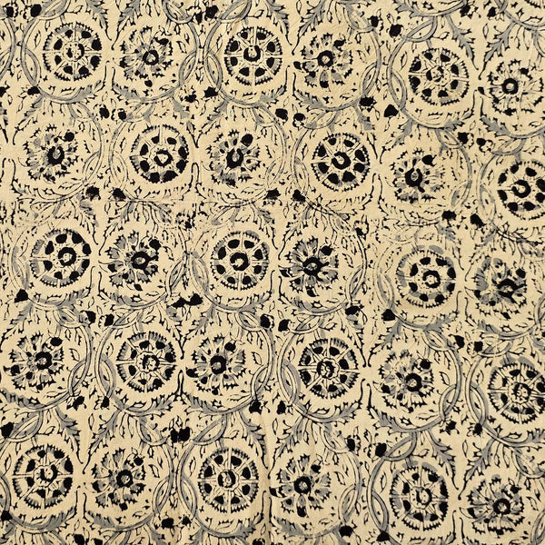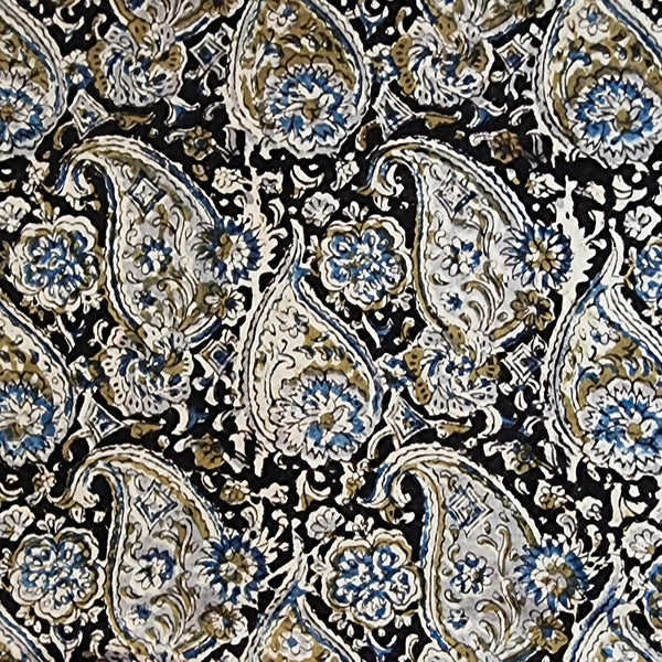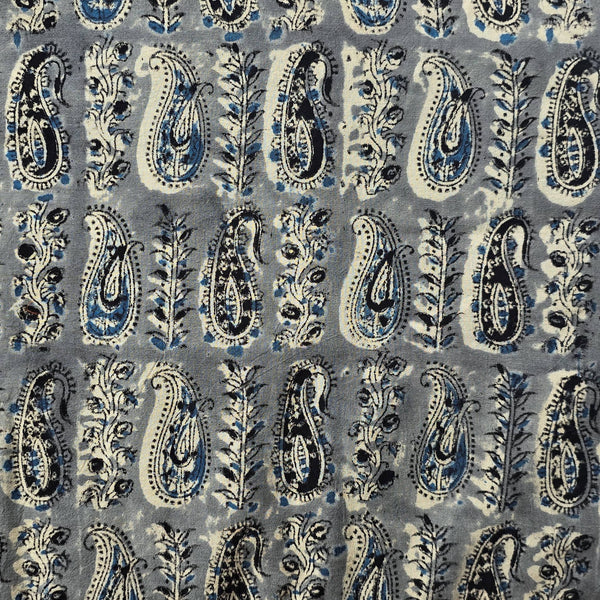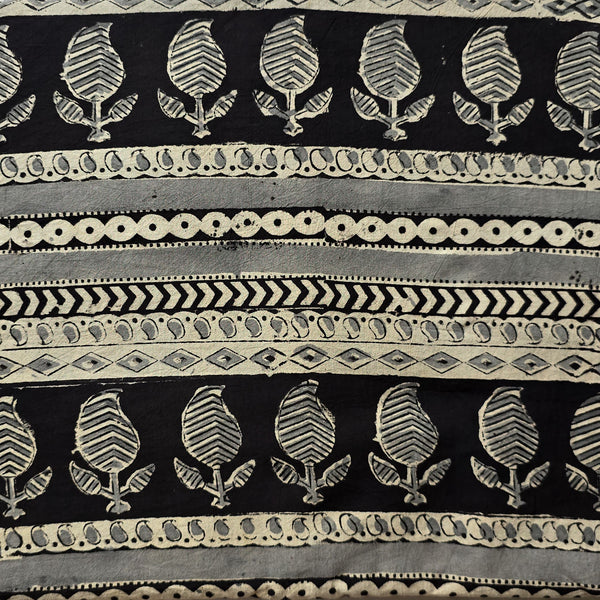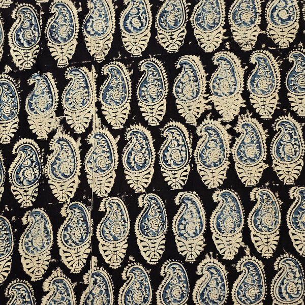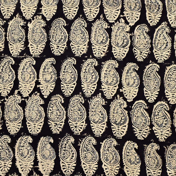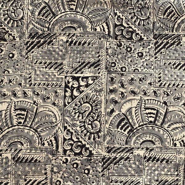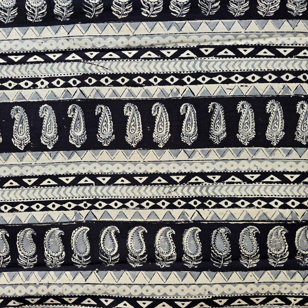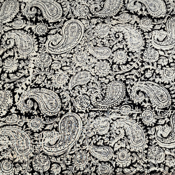 Pure Cotton Kalamkari Black With Cream And Grey Mango Design Border Hand Block Print Fabric