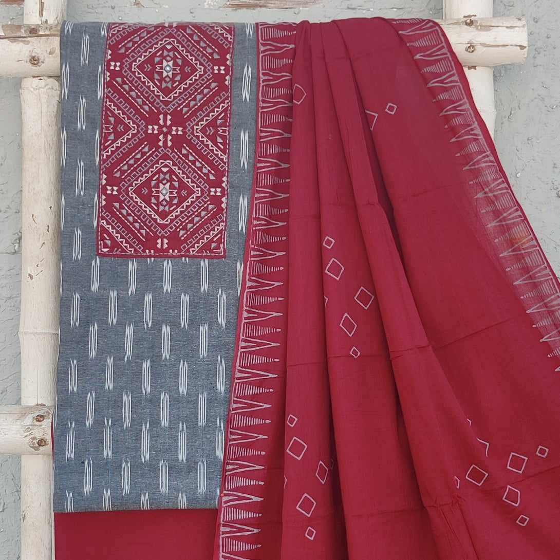AASHVI-Pure Cotton Ikkat Grey With Maroon Yoke Top And Plain Maroon Bottom And Cotton Dupatta