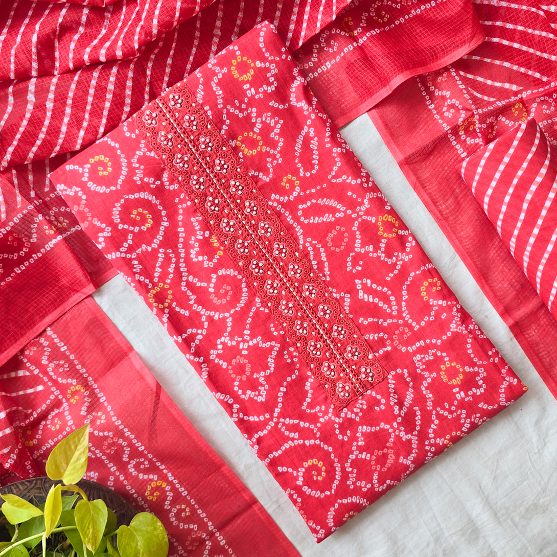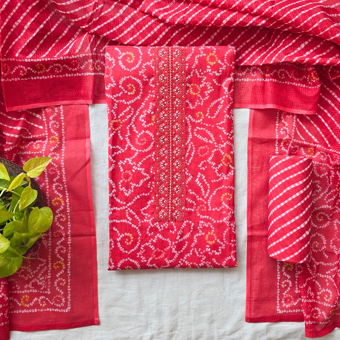 Aditi -Pure Cotton Bandhani Red And White With Yoke Suit