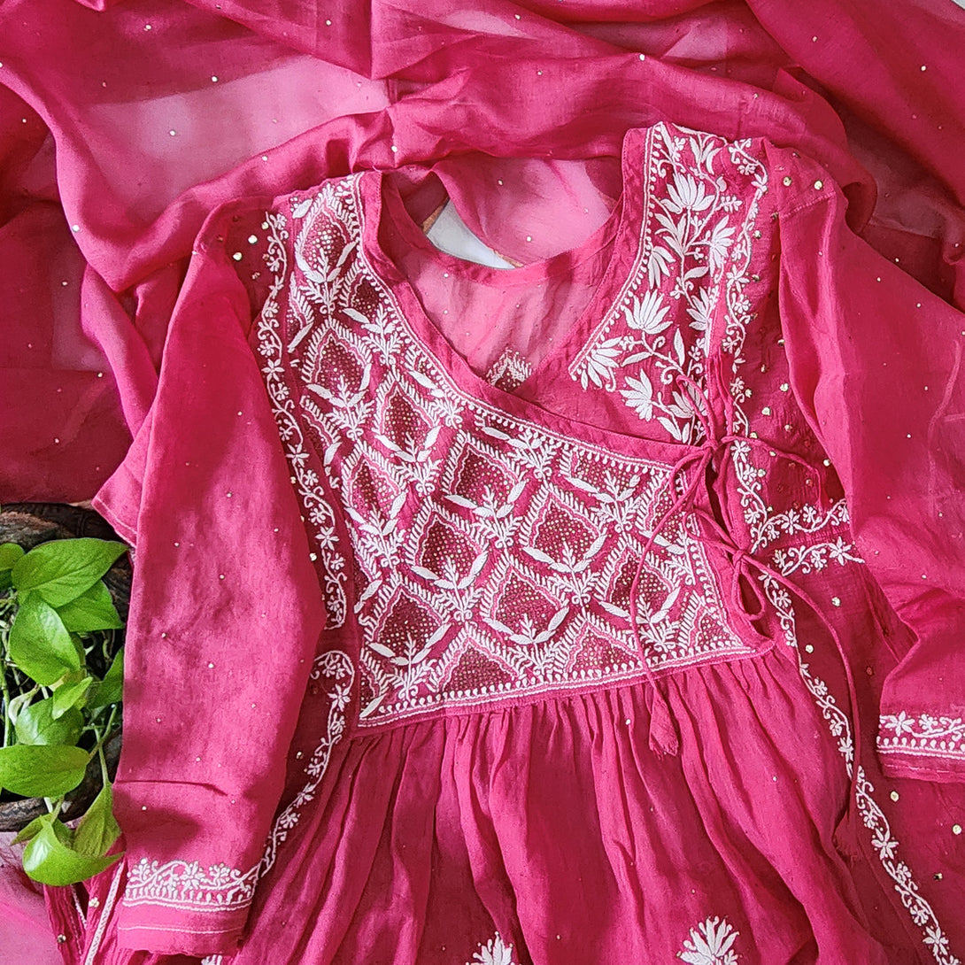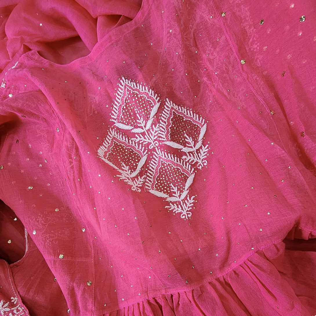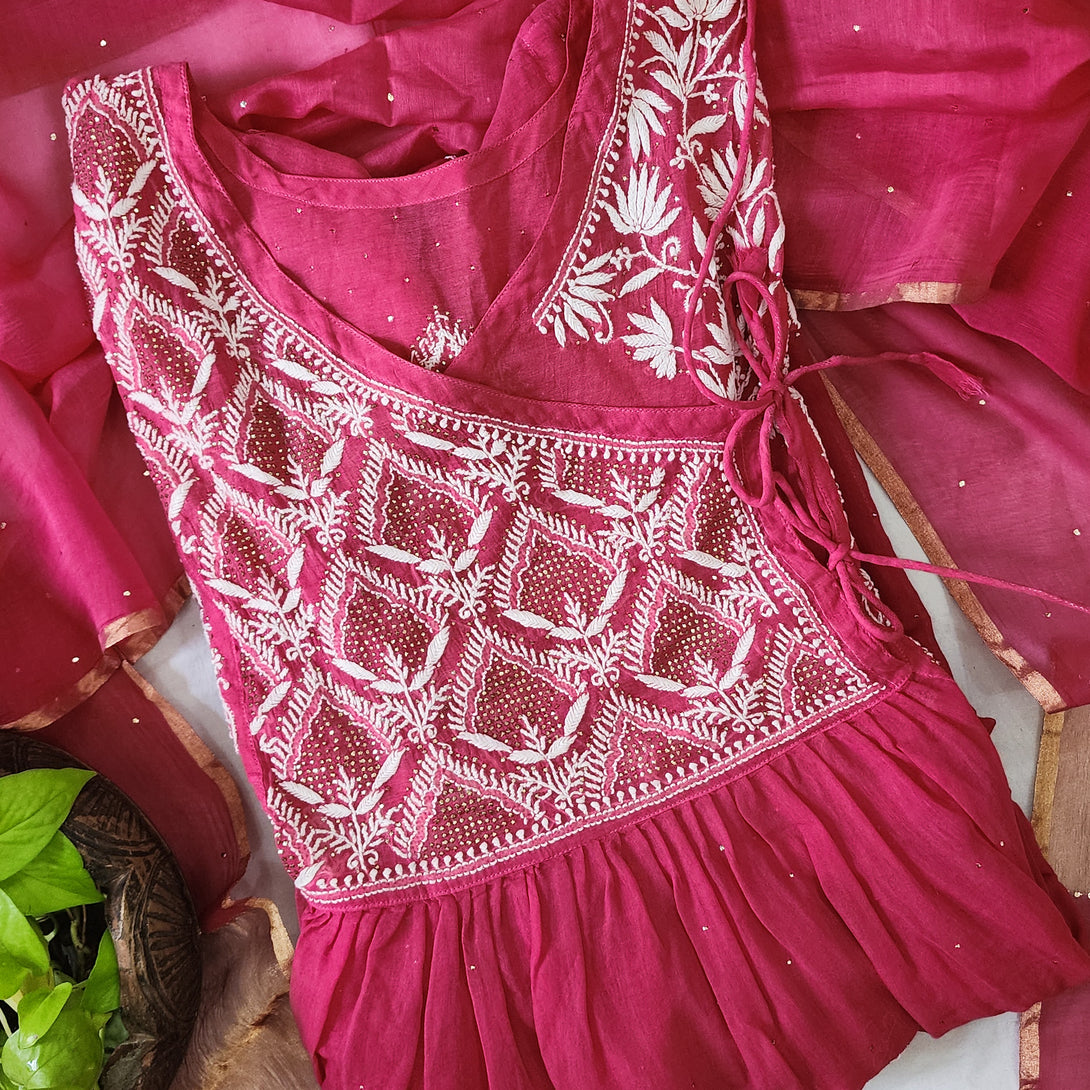 ALAMZEB-Mul Chanderi Angrakha Pink Emboiderey With Zari Work Neck Top And Mul Chanderi Dupatta