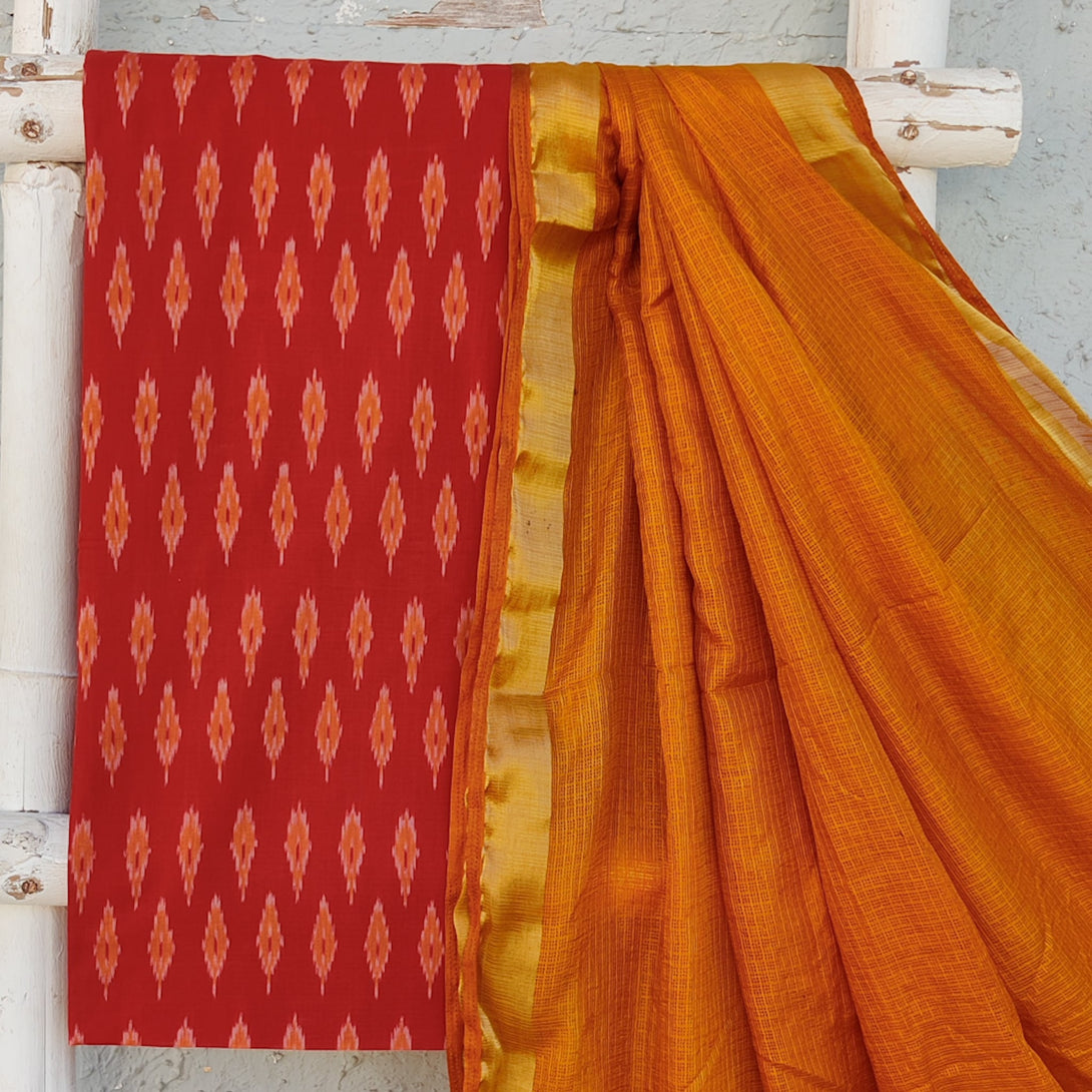 ANUBHA- Pure Cotton Mercerised Ikkat With Semi Kota Plain Dupatta Red With Mustard