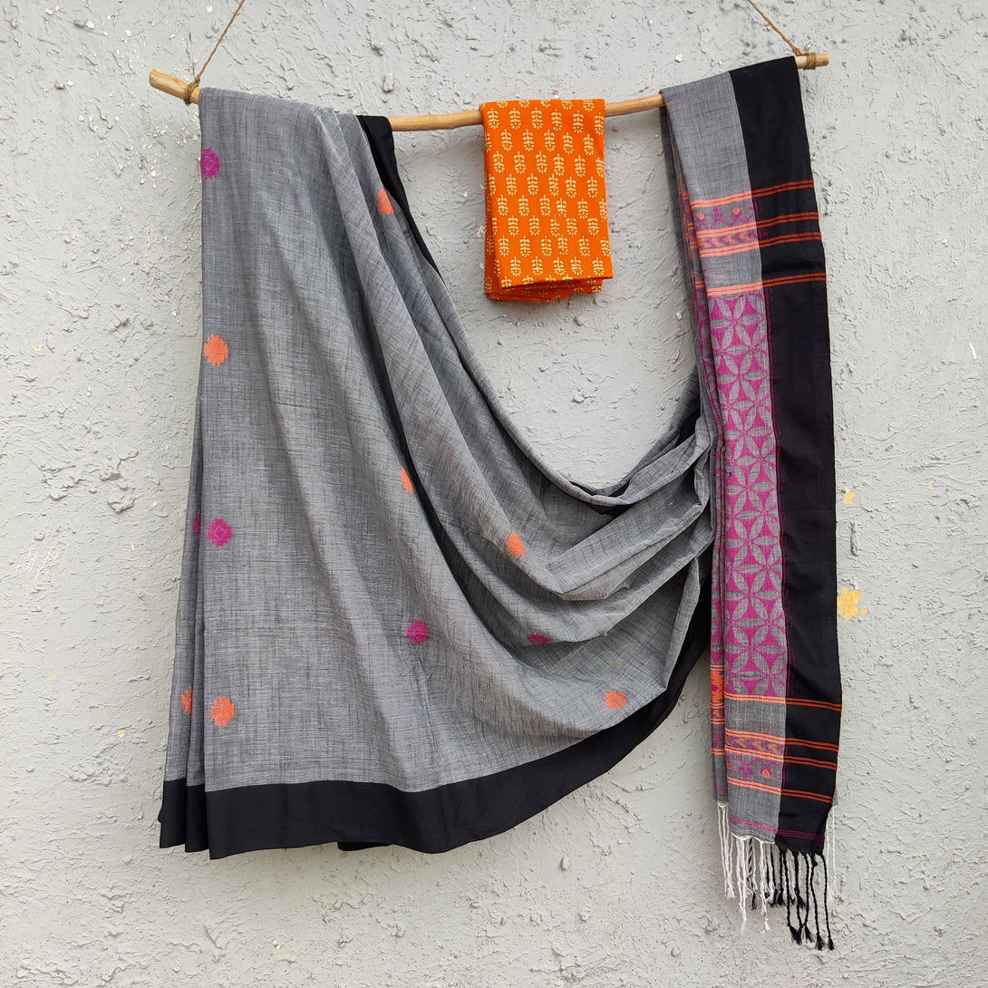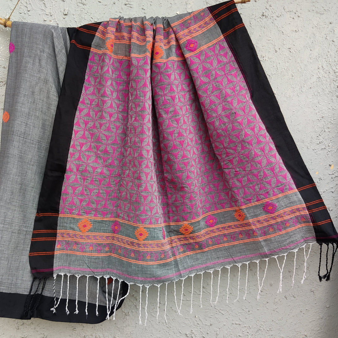 AROHI - Pure Cotton Bengal Weaves Saree Grey Black