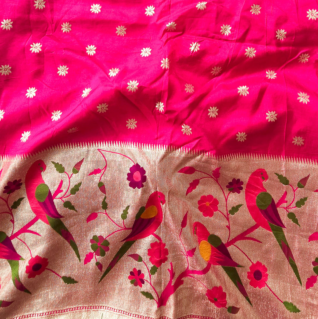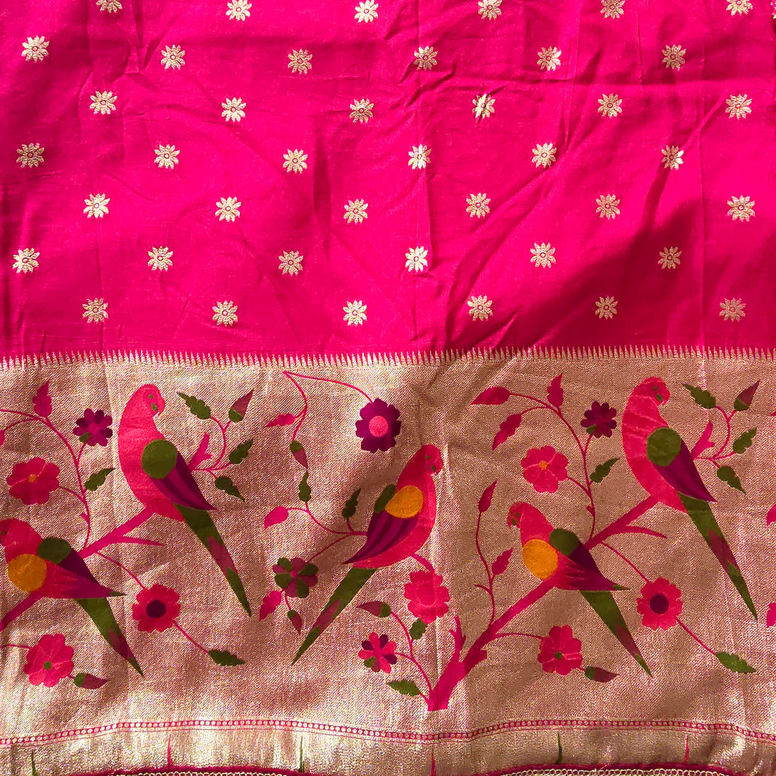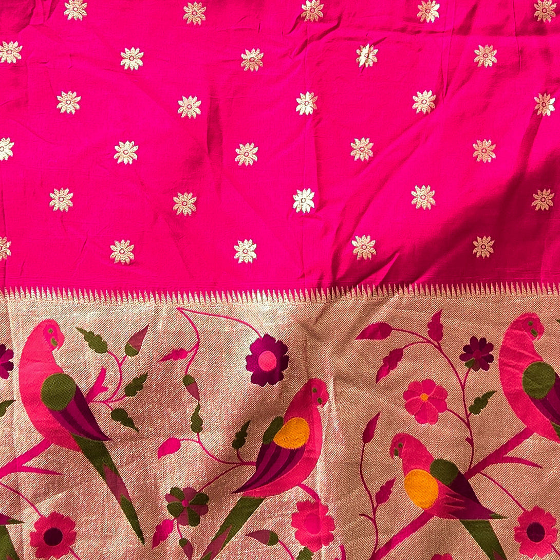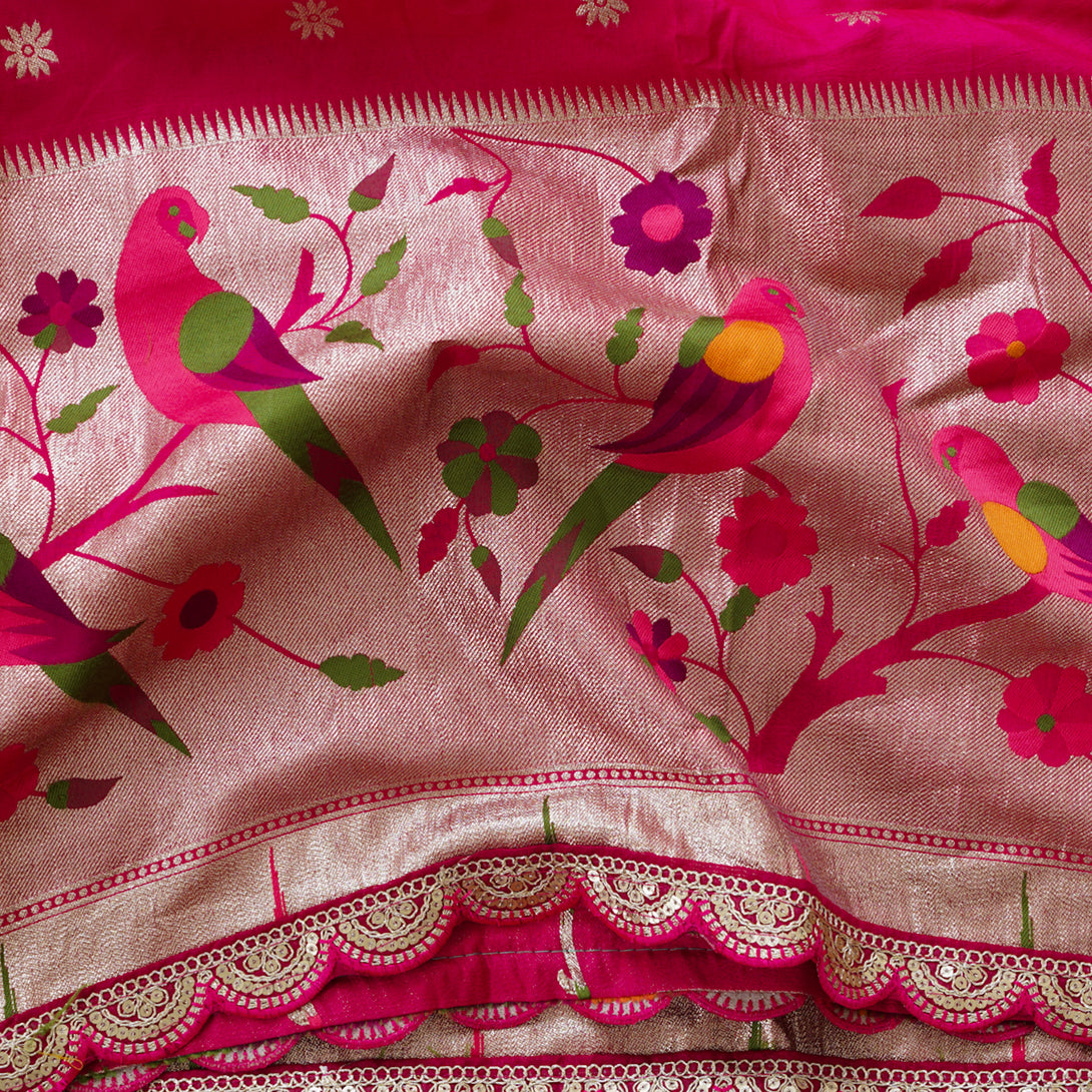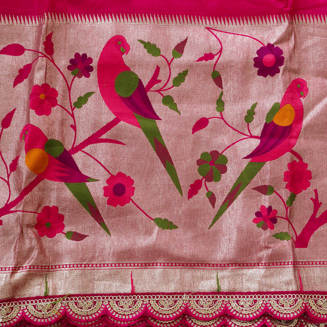 Banarasi Brocade Pink With Beautiful Parot And Golden Flower Jaal Big Border Fabric