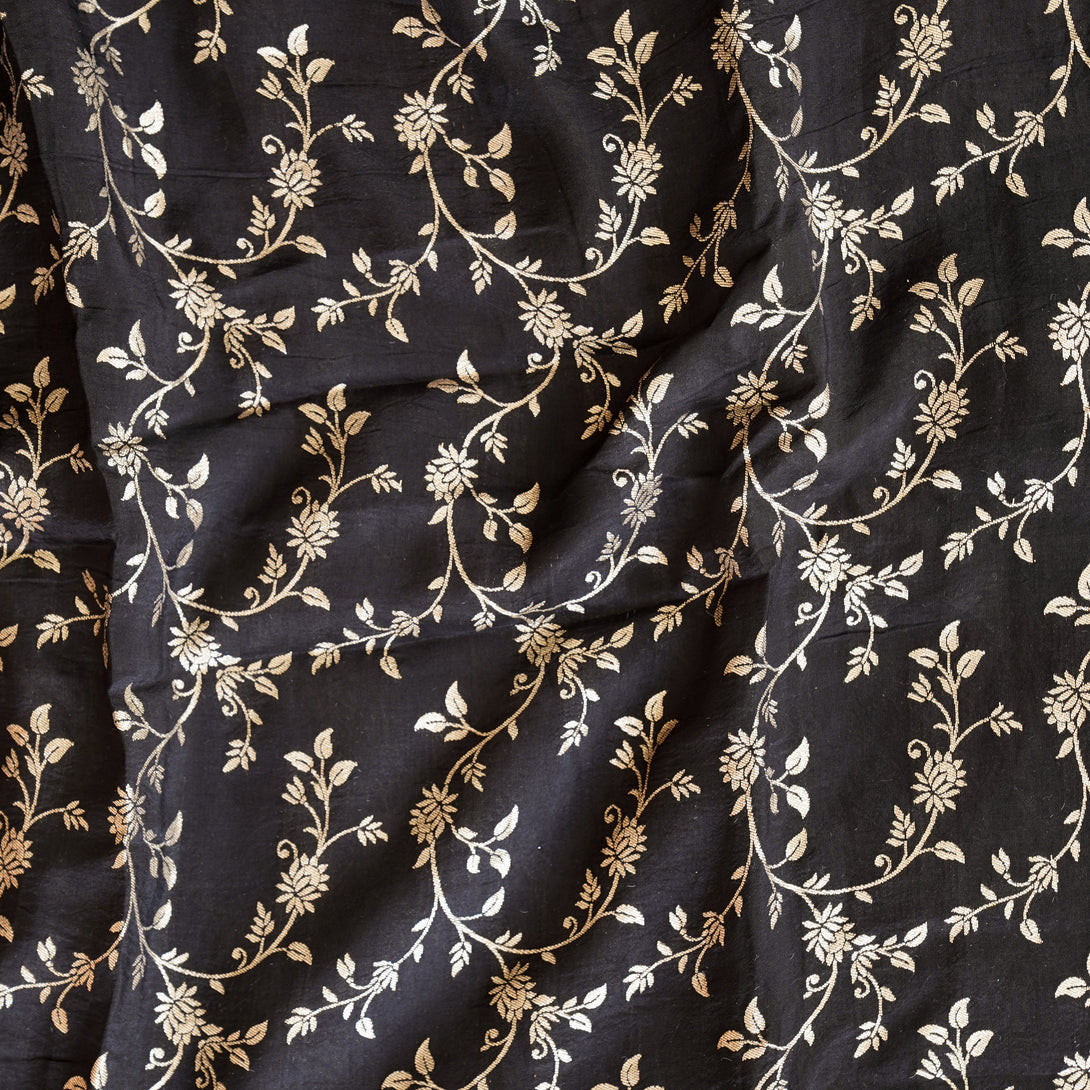 Dola Silk Brocade Black With Golden Zari Flower Jaal Fabric