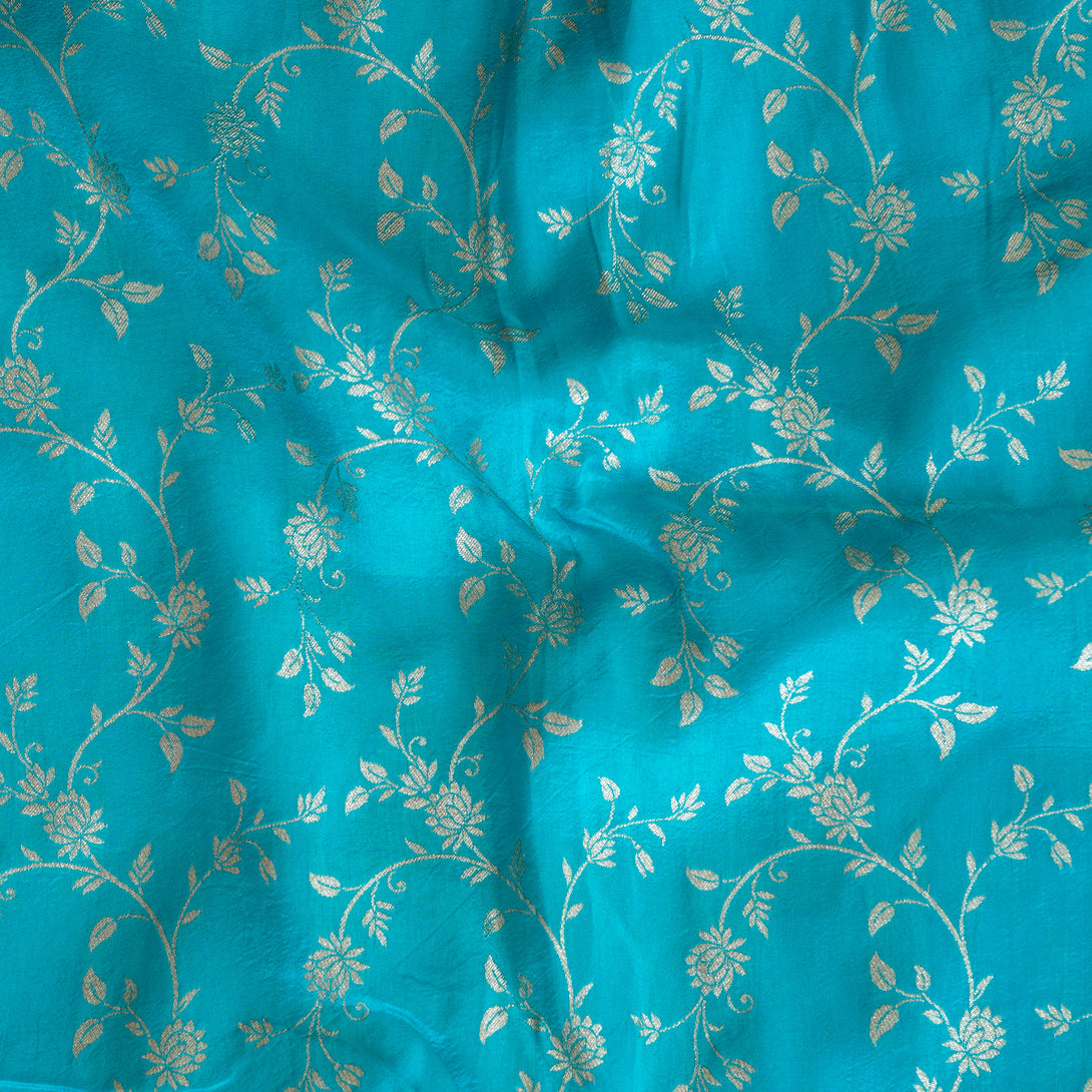 Dola Silk Brocade Blue With Golden Zari Flower Jaal Fabric