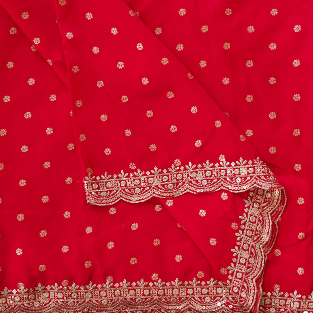 Dola Silk Brocade Red With Golden Zari Flower Butti and Zari Embroidary Border Fabric