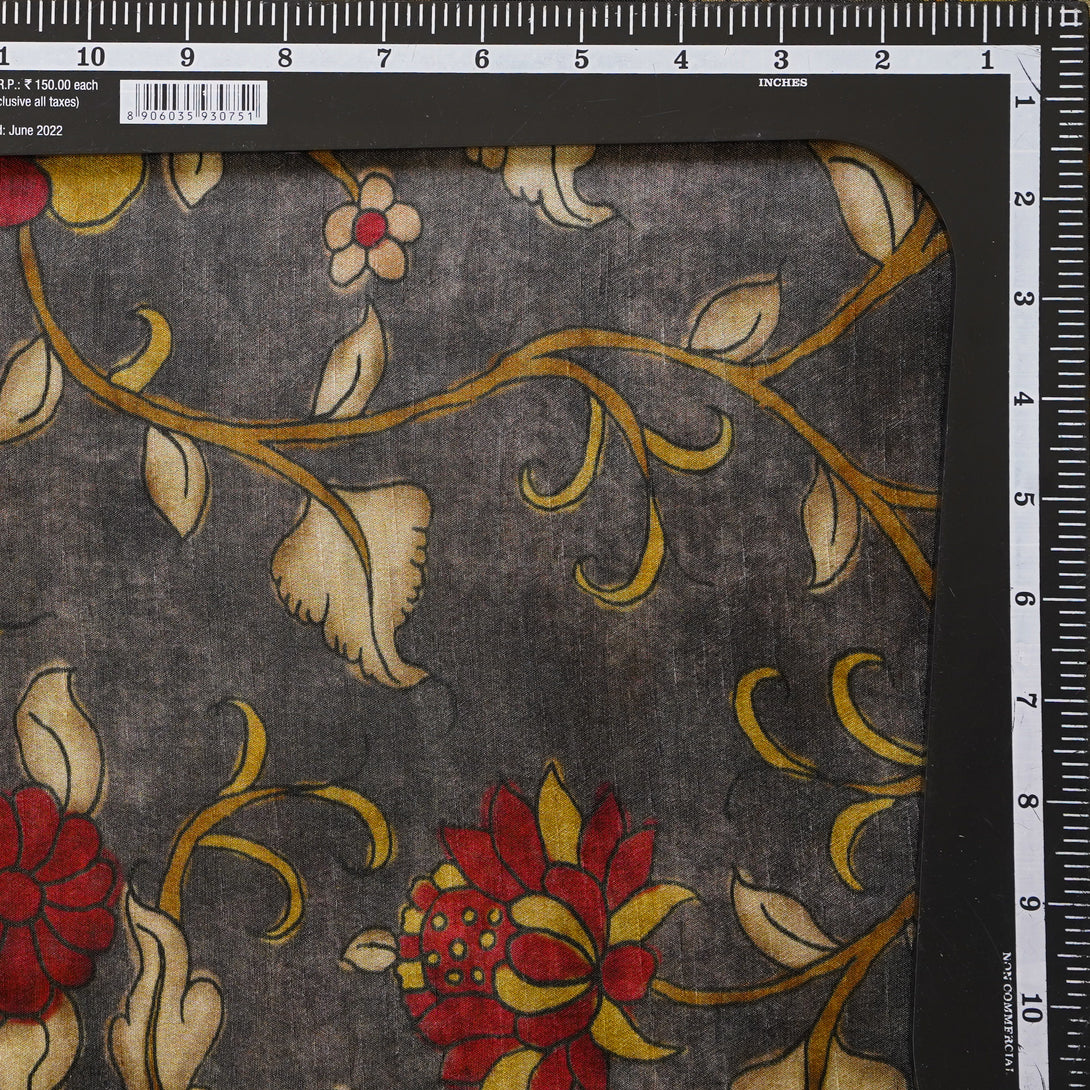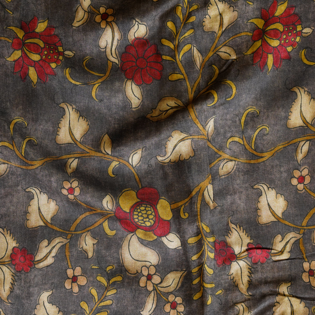 Dola Silk Kalamkari Digital Print Grey With Red Flower Jaal Fabric