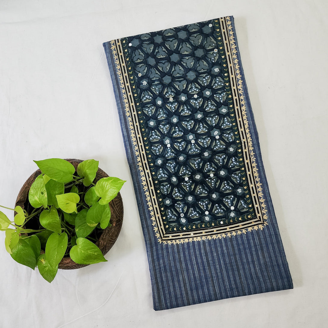 EKTA-Pure Cotton Handloom Blue With Navy Blue Stripes With Vansapati Emboriderey Yoke Pre-Design Unstitched Kurta Fabric