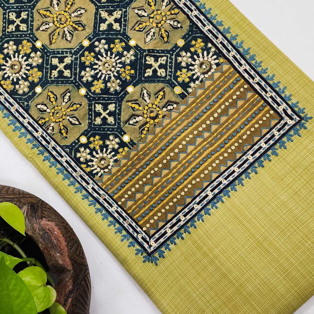 EKTA-Pure Cotton Handloom Light Green With Vanaspati Emboriderey Yoke Pre-Design Unstitched Kurta FabricFabric Type : Pure Cotton Handloom