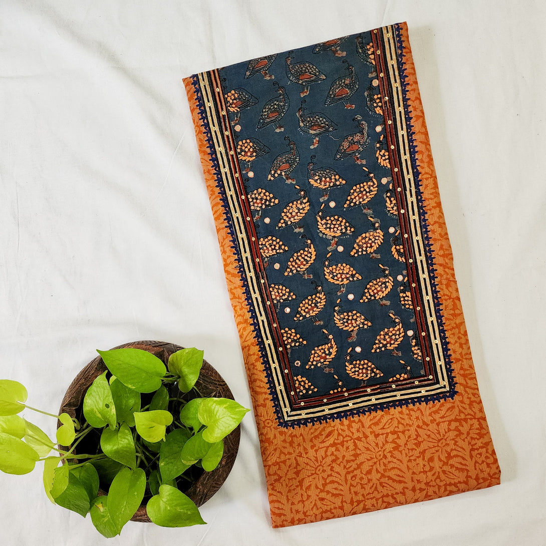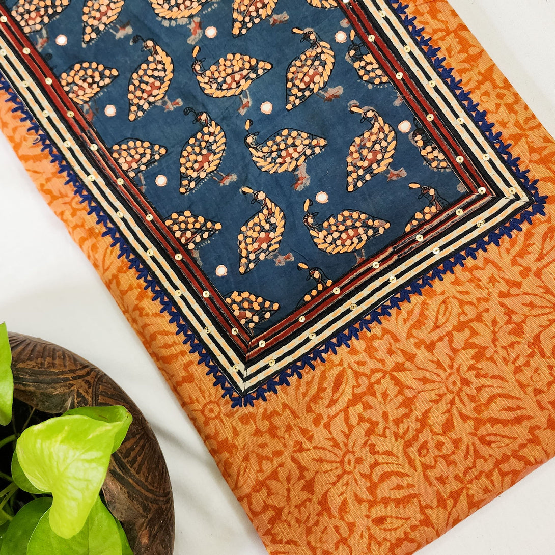 EKTA-Pure Cotton Handloom Orange With Rust Blue Emboriderey Yoke Pre-Design Unstitched Kurta Fabric