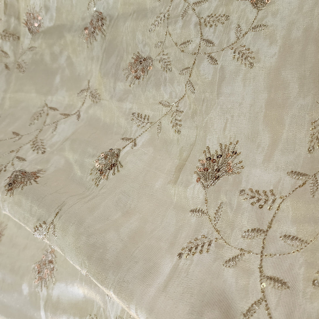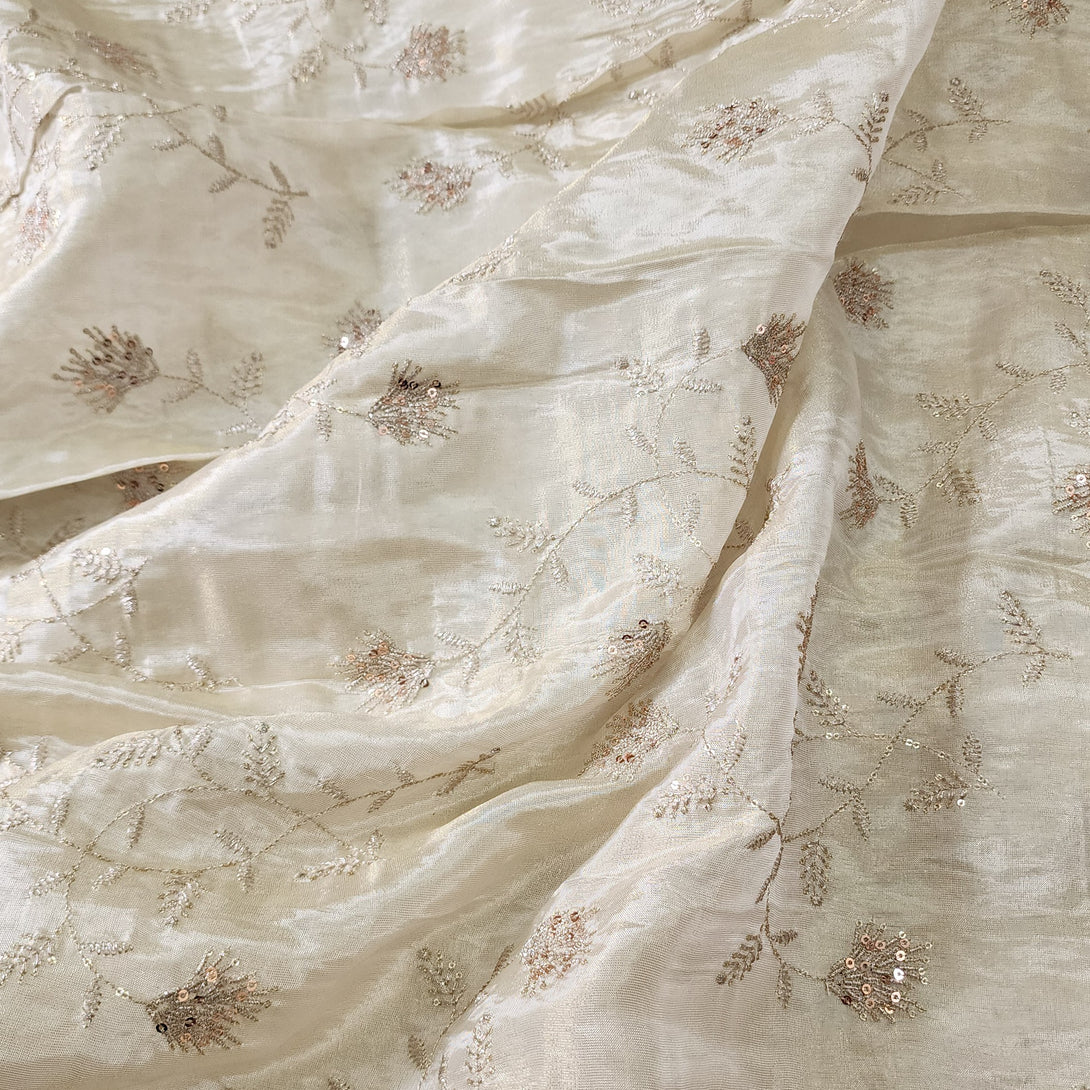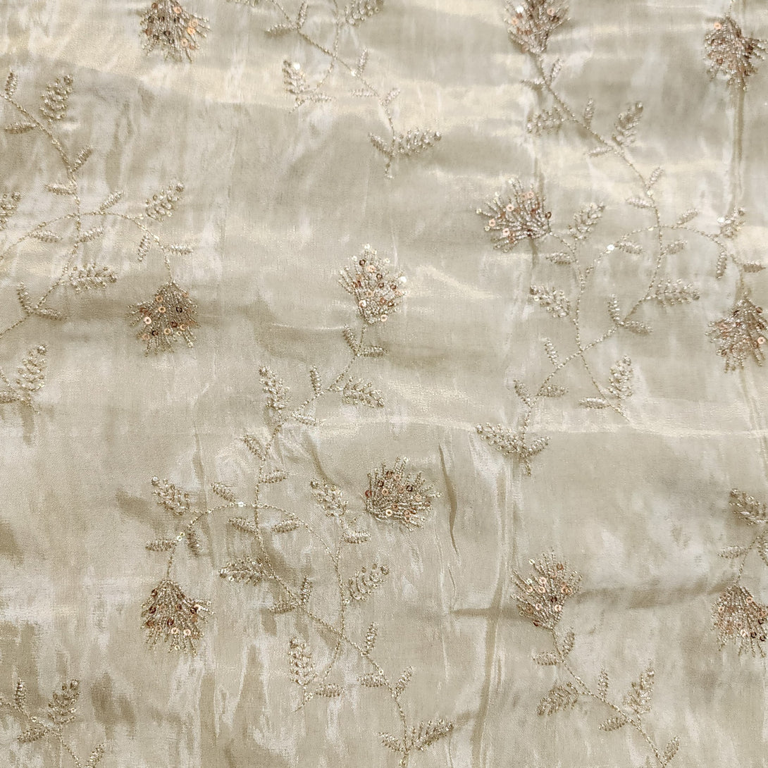 ( Width 45 Inches ) Emboiderey Tissue Cream Zari Work Flower Jaal Hand Woven Fabric