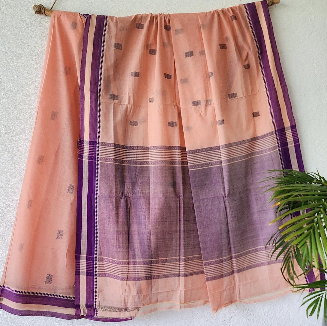 Godavani -Pure Cotton Handloom Peach With Purple Border Saree