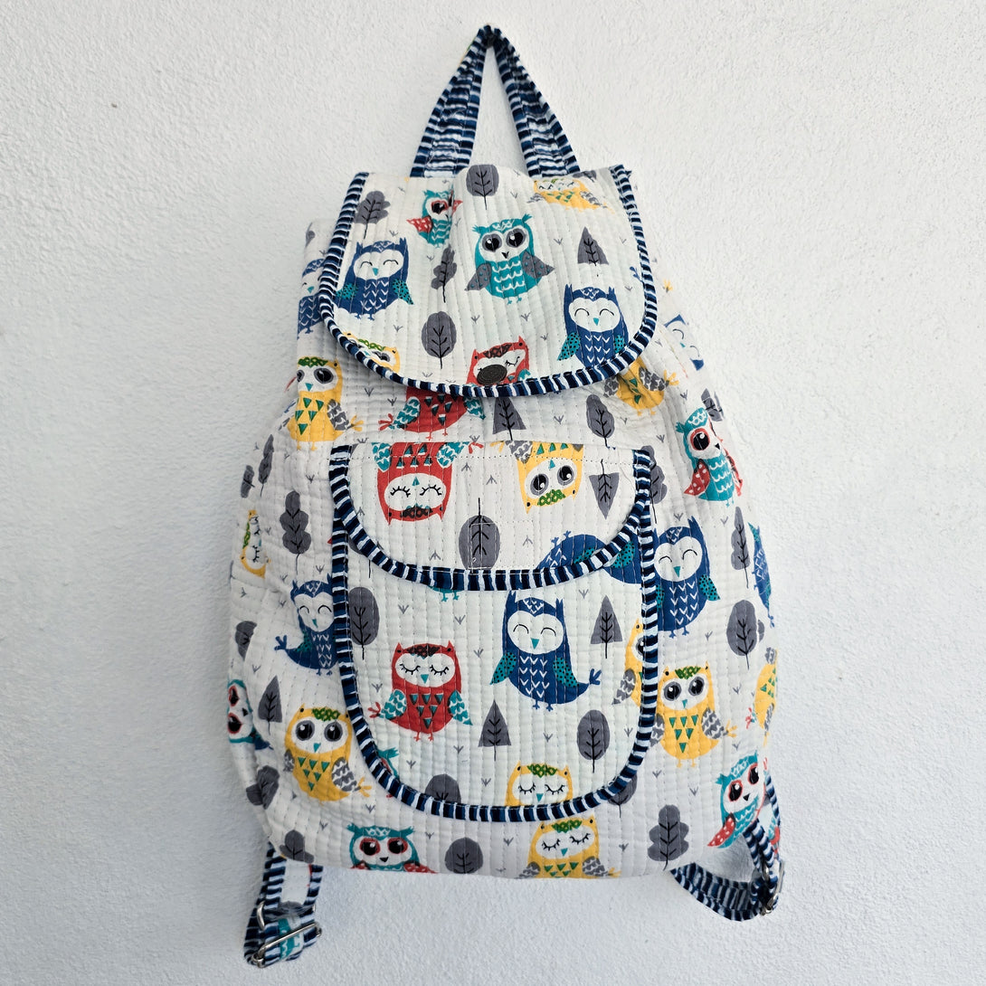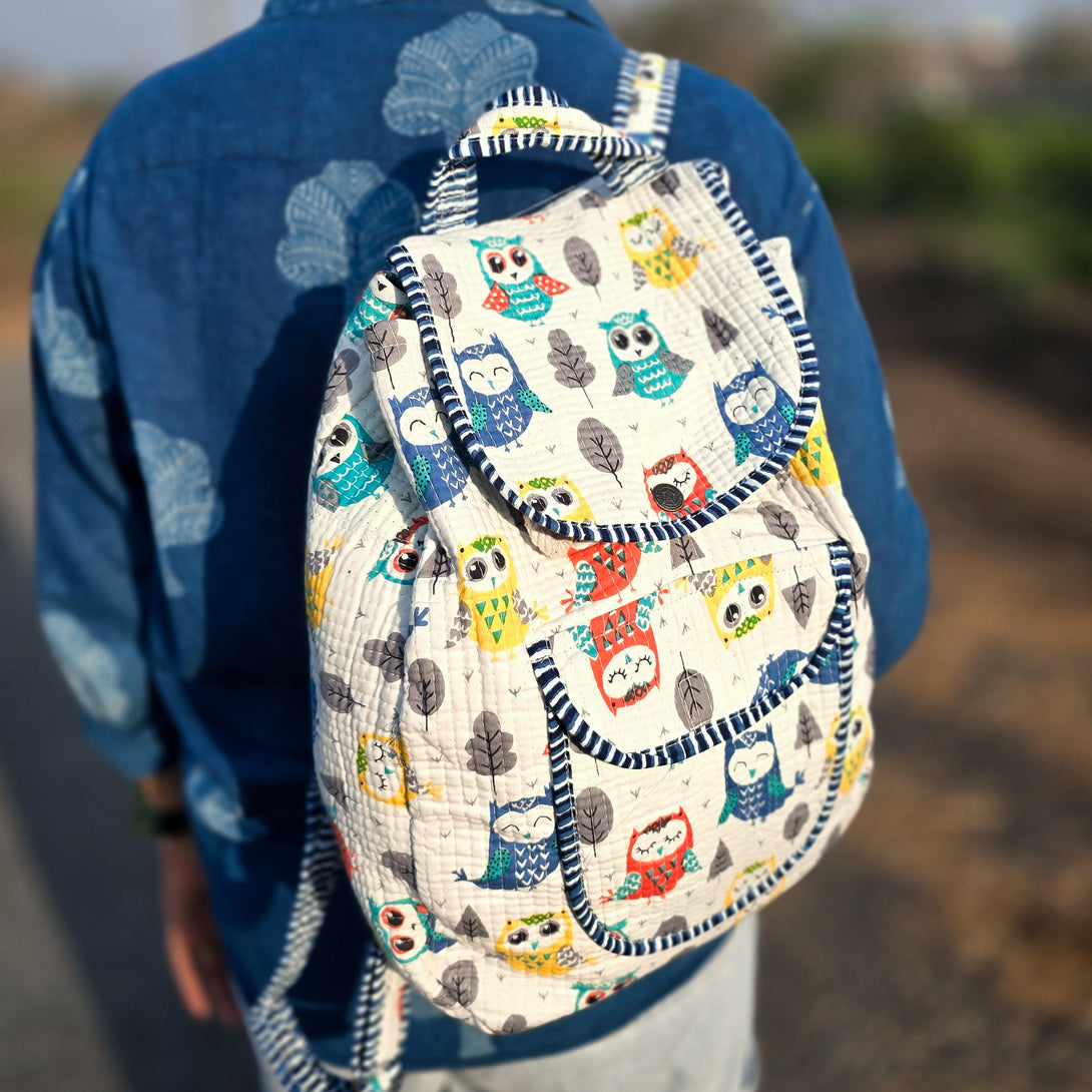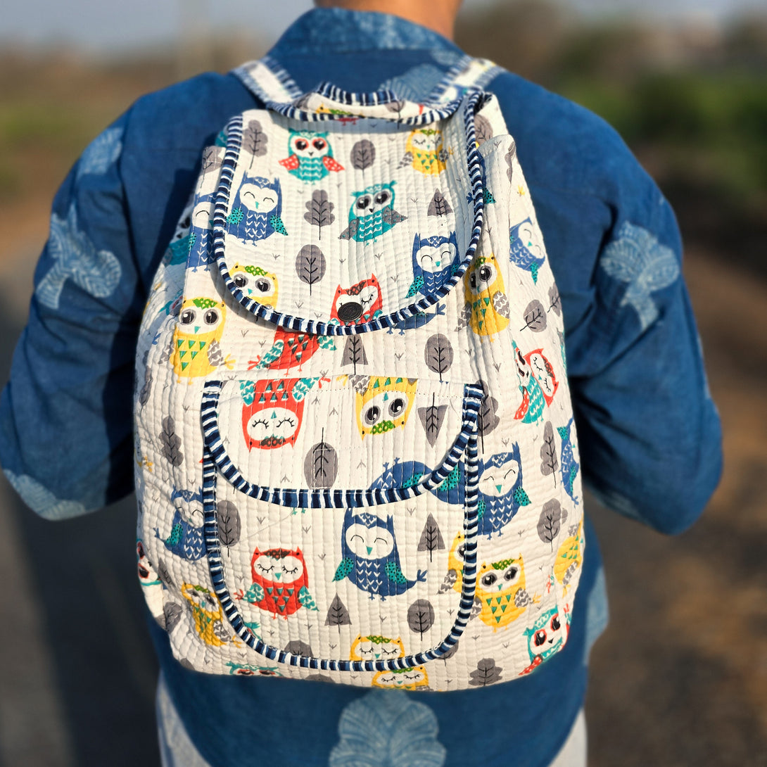 Jaipuri Quilted Backpack -White With Cute Owl Bird Motif