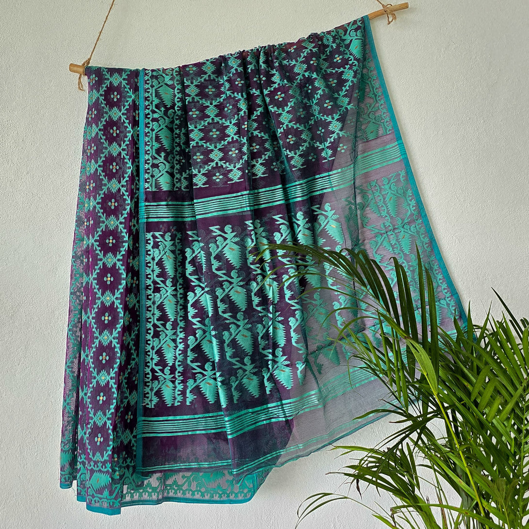 JAMDANI-Jamdani Brasso Navy Blue With Green Design Saree