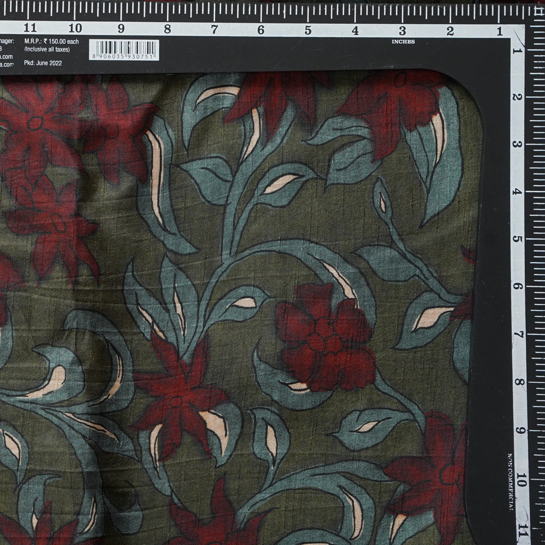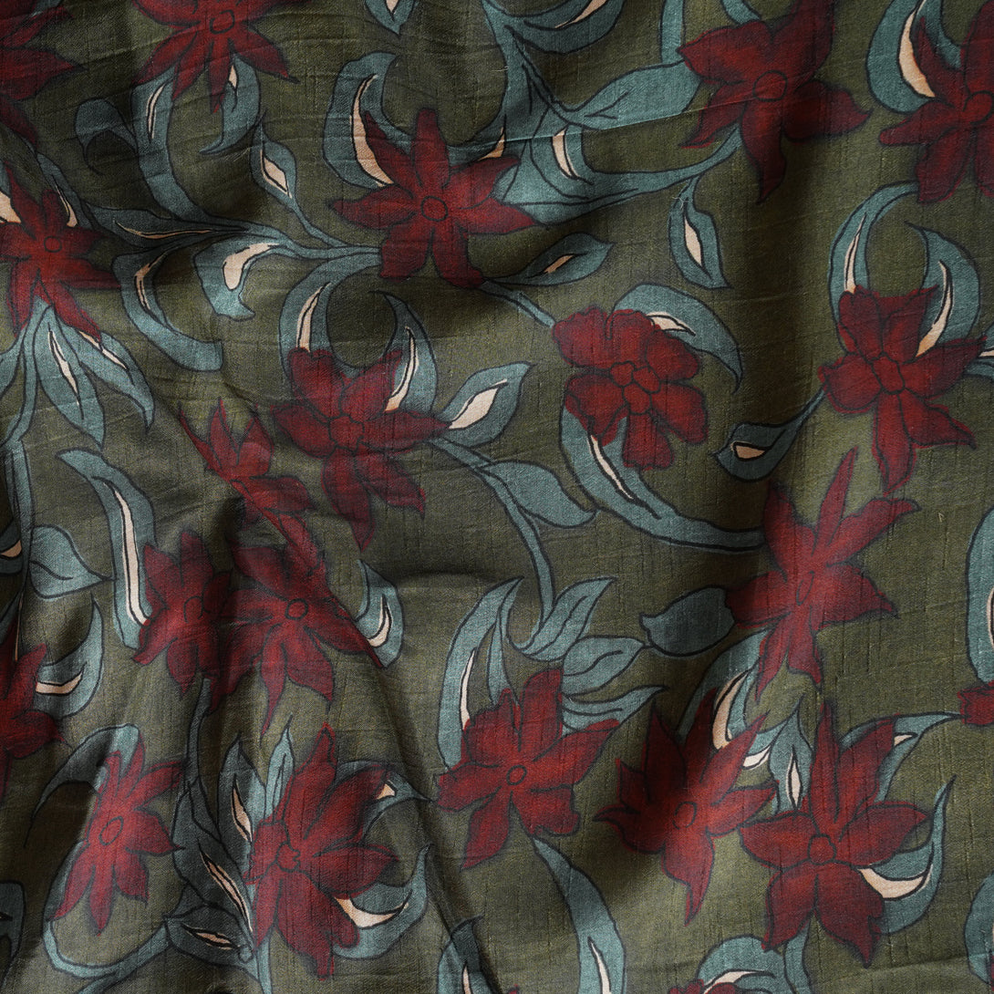 Dola Silk Kalamkari Digital Print Dark Mehandi Green With Maroon Jaal Fabric