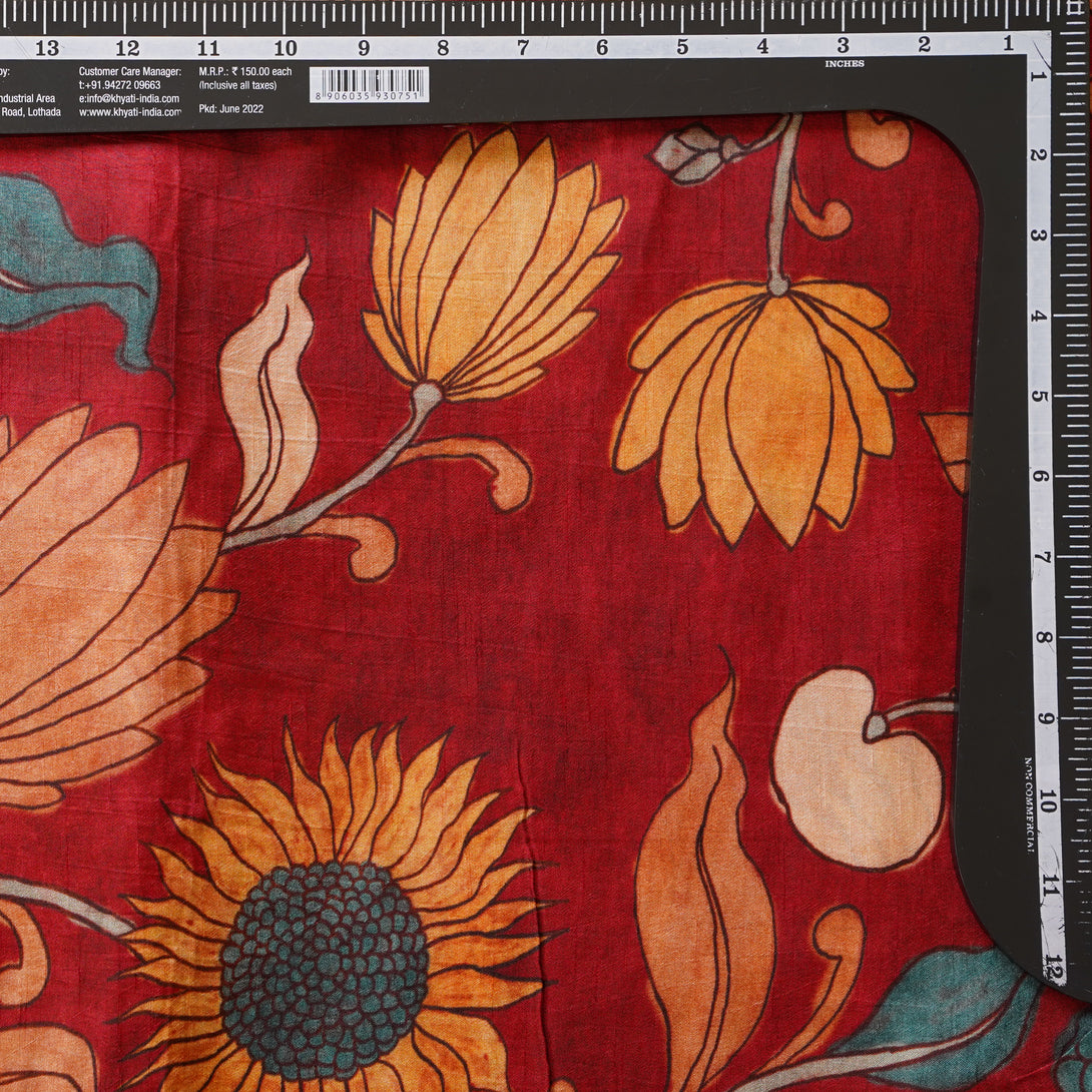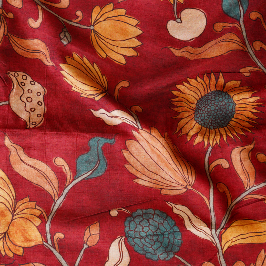 Dola Silk Kalamkari Digital Print Rust Red With Teal And Mustard Flower Jaal Fabric