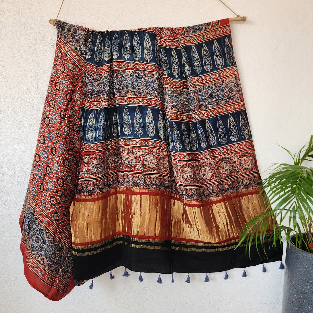 KAREENA-Modal Silk Ajrak Rust Red With Blue stars Design Ghicha Pallu Saree