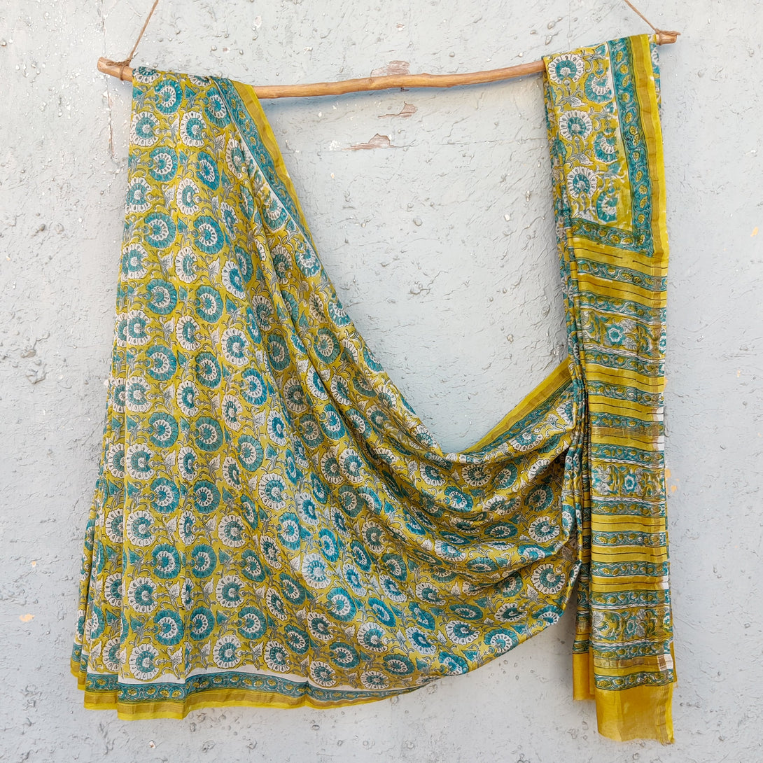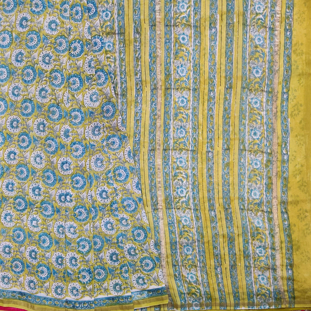 KASTURI - Pure Chanderi Light Green Jaipuri Blue Small Flower Jaal Saree