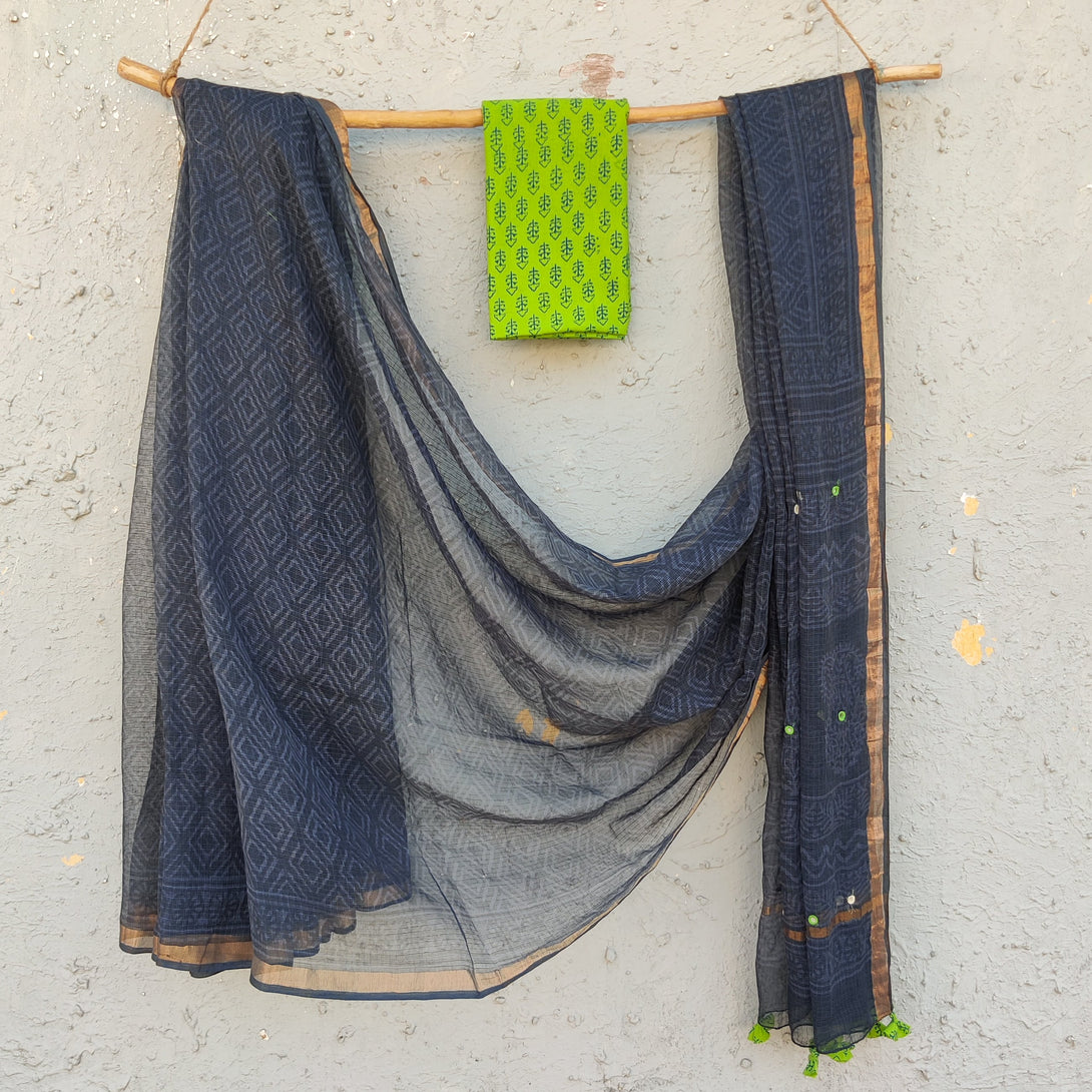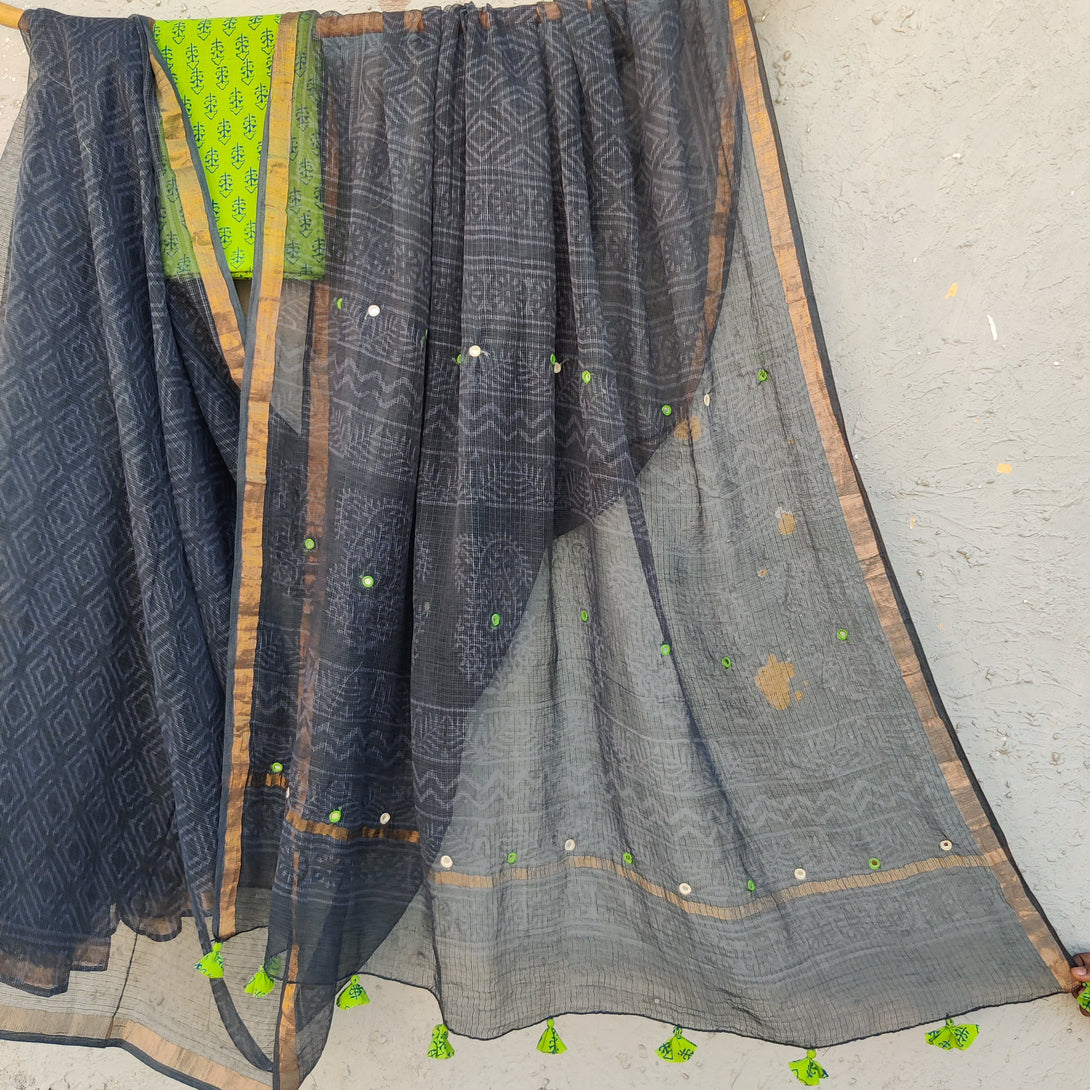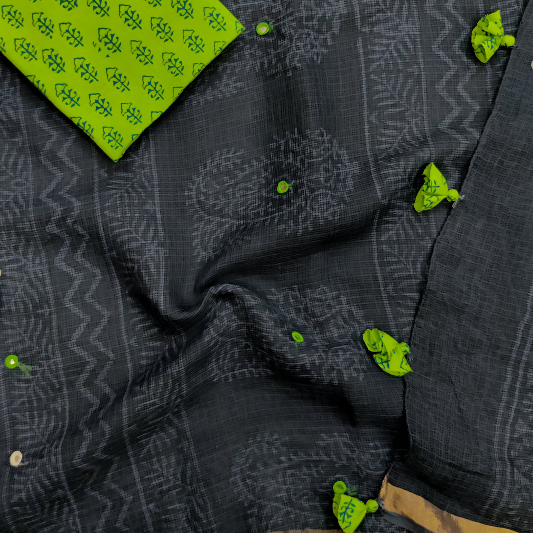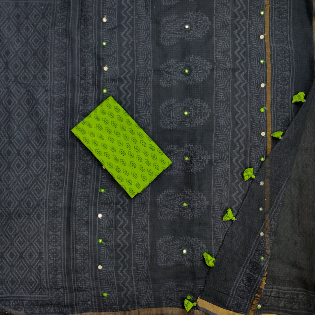 KOTA QUEEN - Pure Cotton Kota Saree With Mirror Embellished Pallu And A Contrast Blouse Drak Grey With Green Blouse