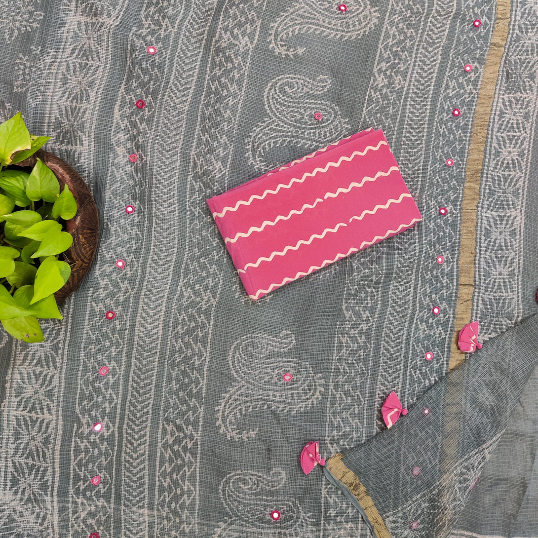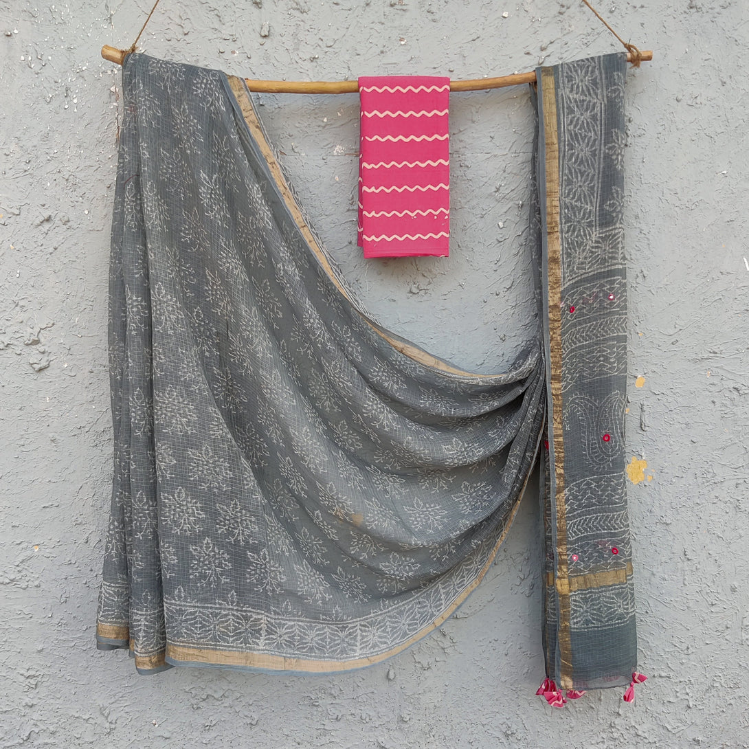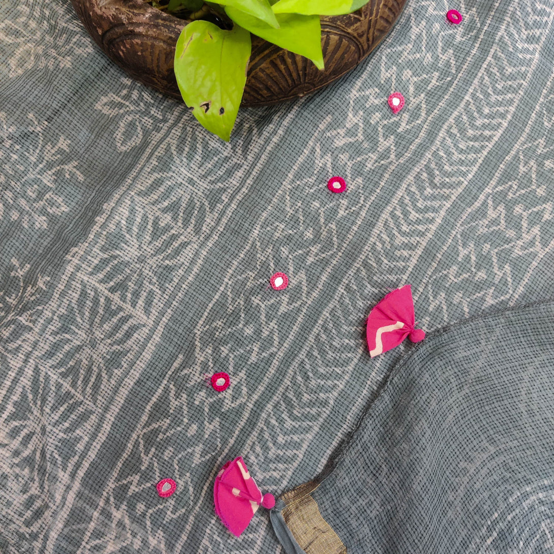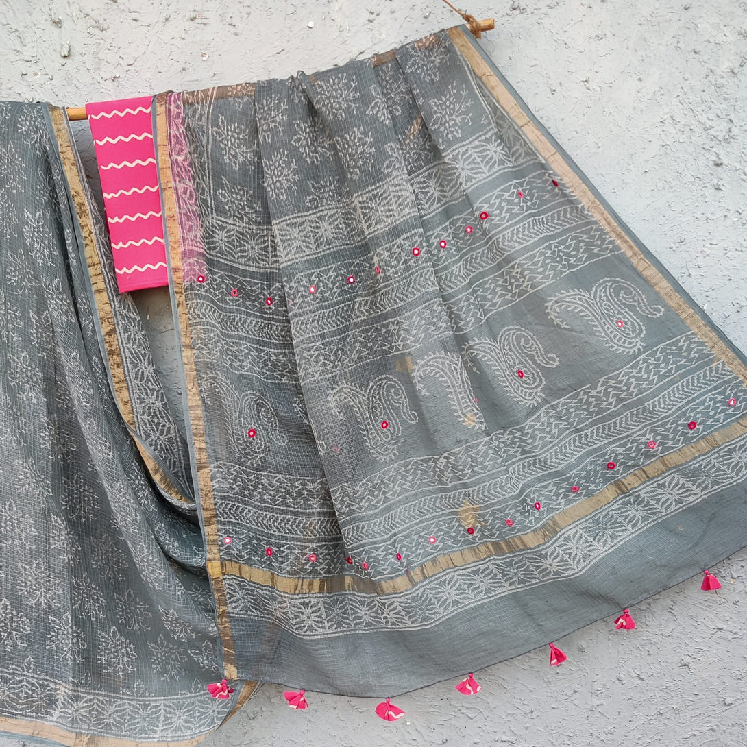 KOTA QUEEN - Pure Cotton Kota Saree With Mirror Embellished Pallu And A Contrast Blouse Grey With Pink And White Waves