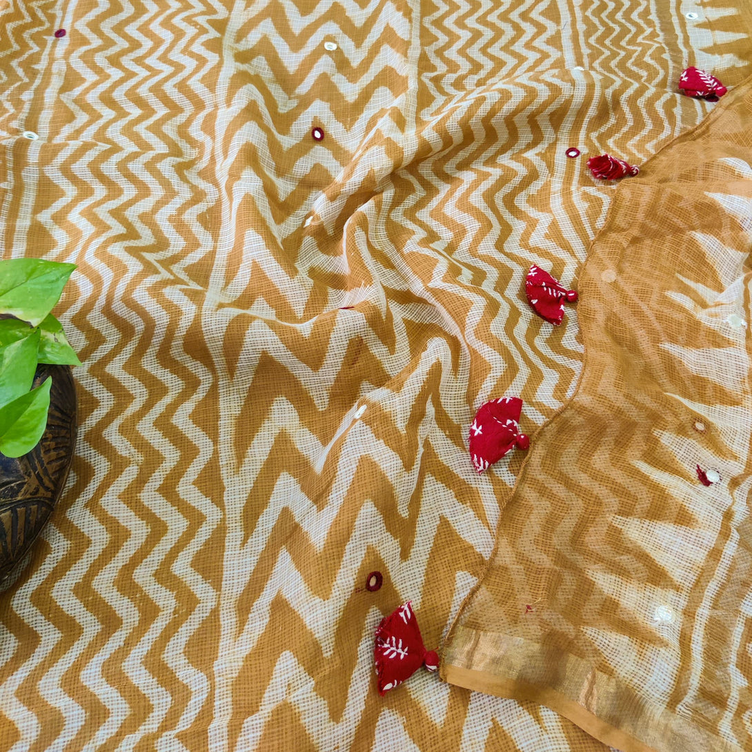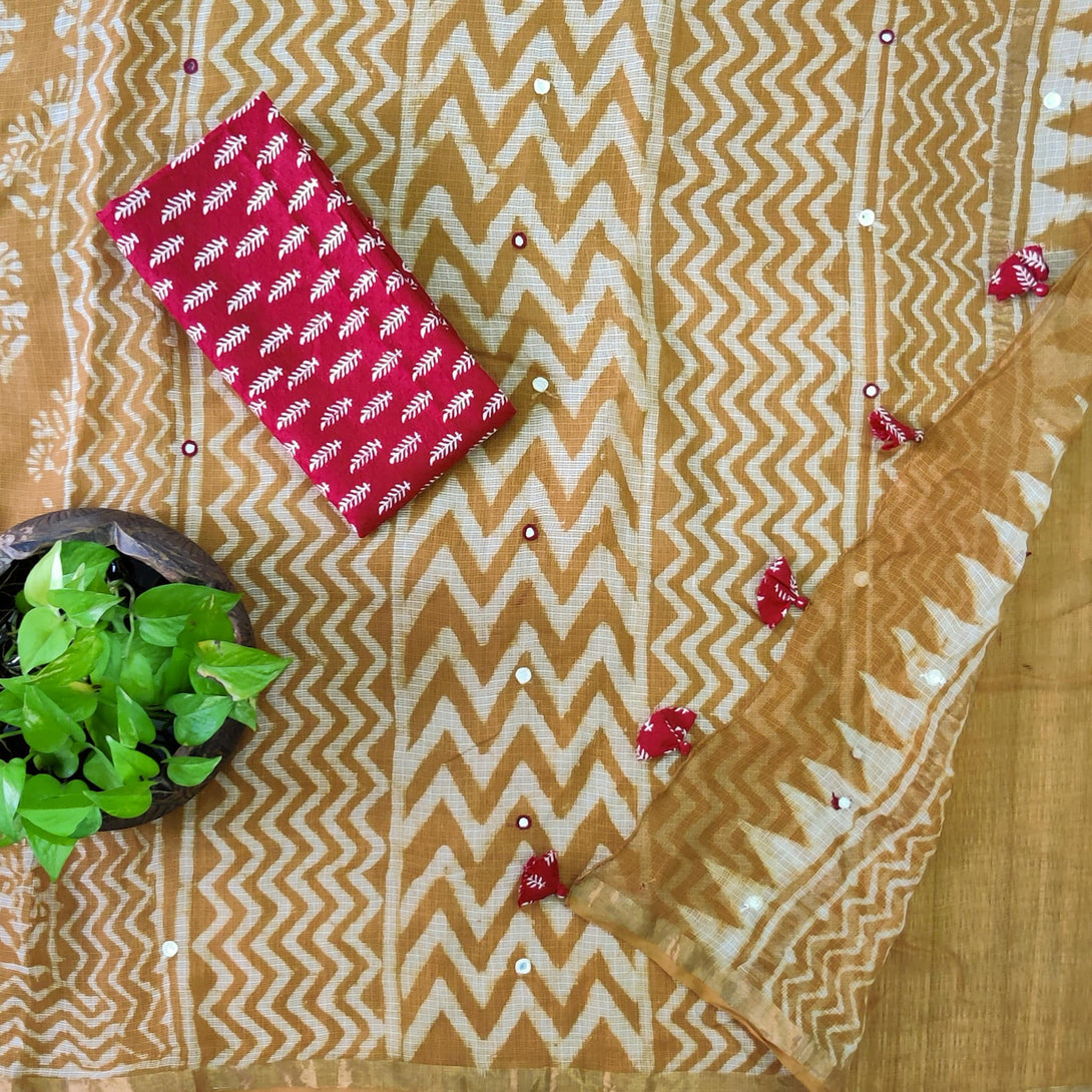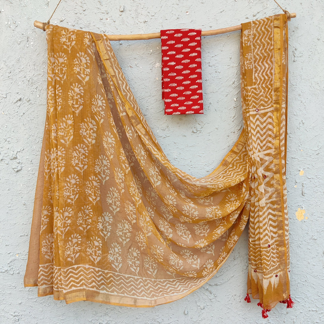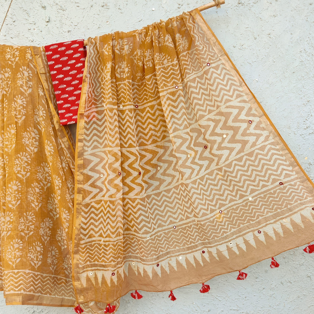 KOTA QUEEN - Pure Cotton Kota Saree With Mirror Embellished Pallu And A Contrast Blouse Mustard Saree With Red Blouse