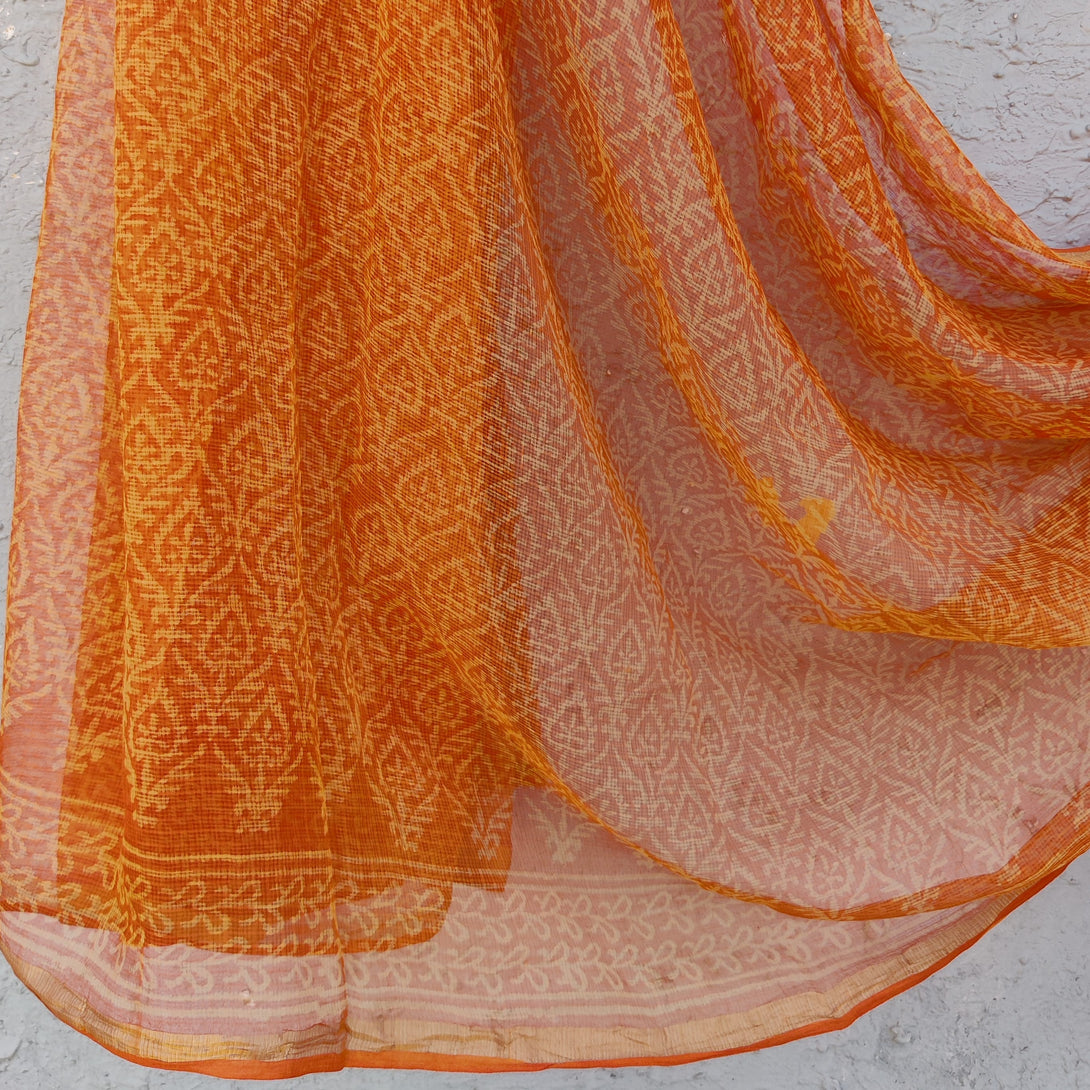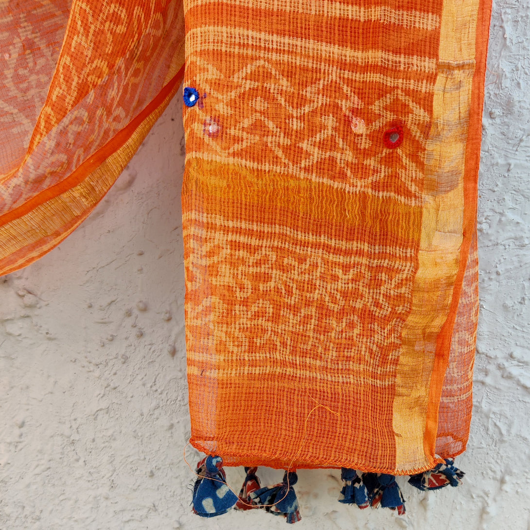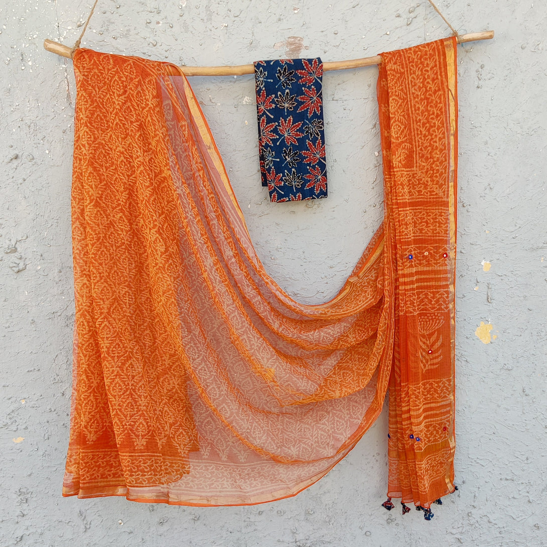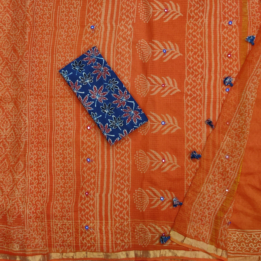 KOTA QUEEN - Pure Cotton Kota Saree With Mirror Embellished Pallu And A Contrast Blouse Orange With Ajrak Blouse