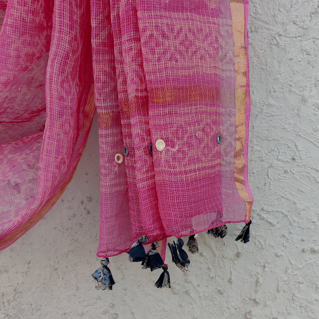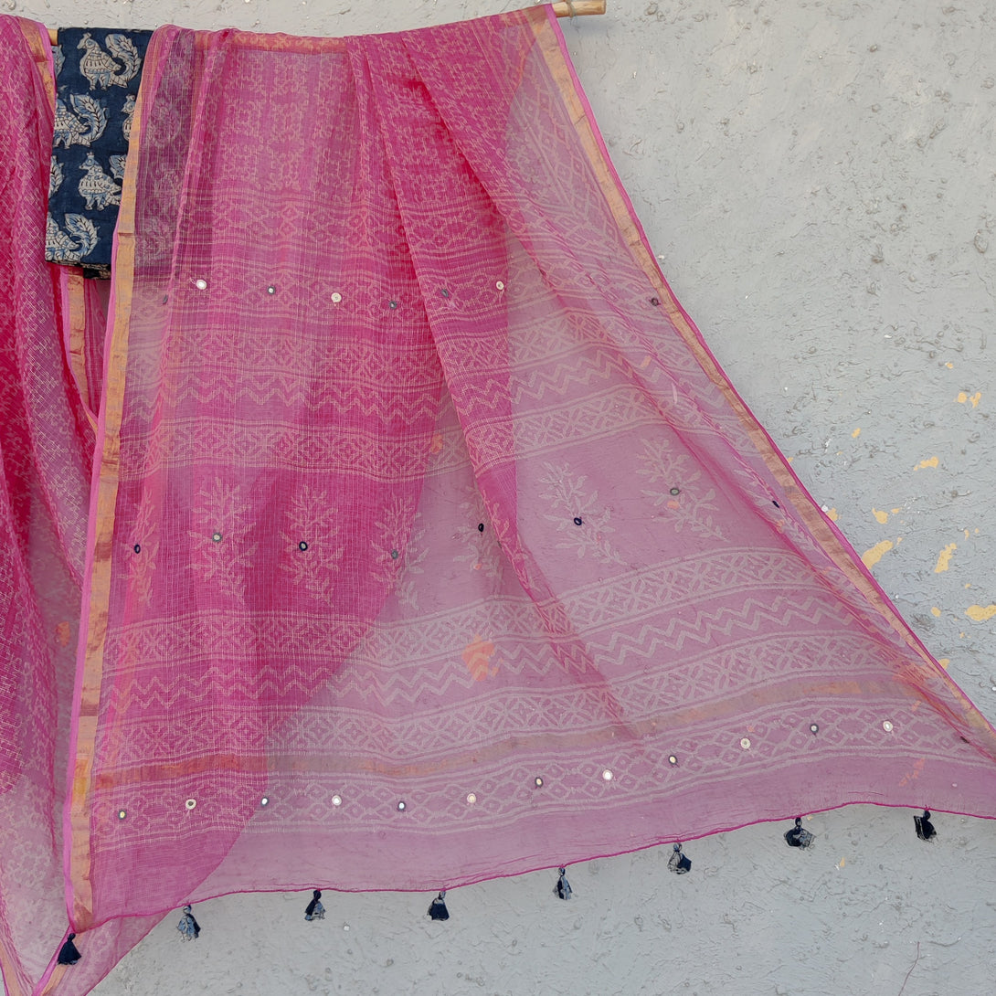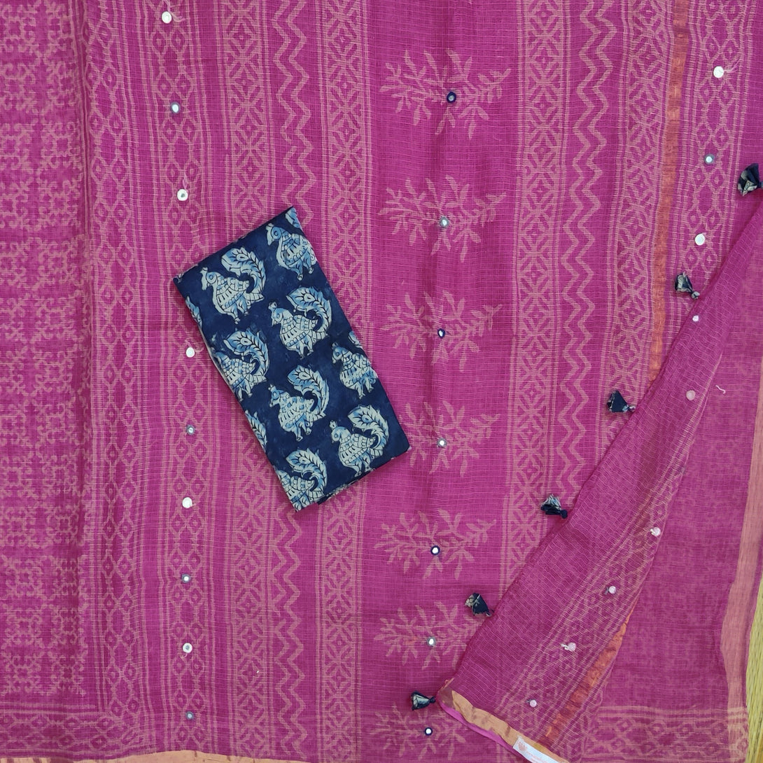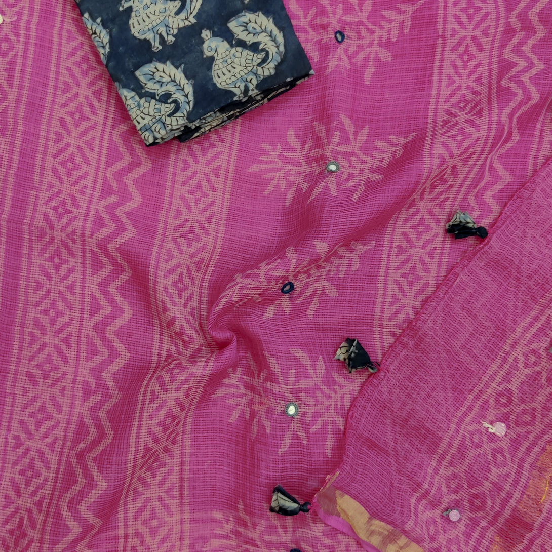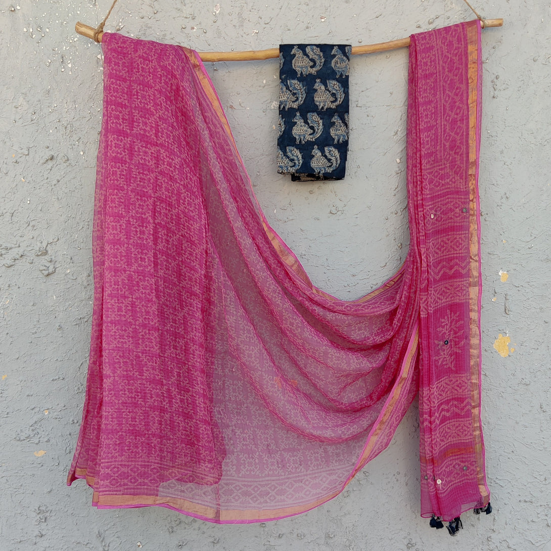 KOTA QUEEN - Pure Cotton Kota Saree With Mirror Embellished Pallu And A Contrast Blouse Pink With Mul Cotton Indigo Kalamkari Blouse