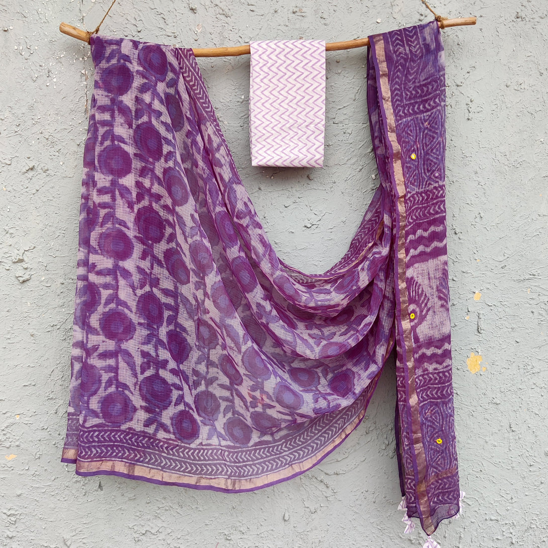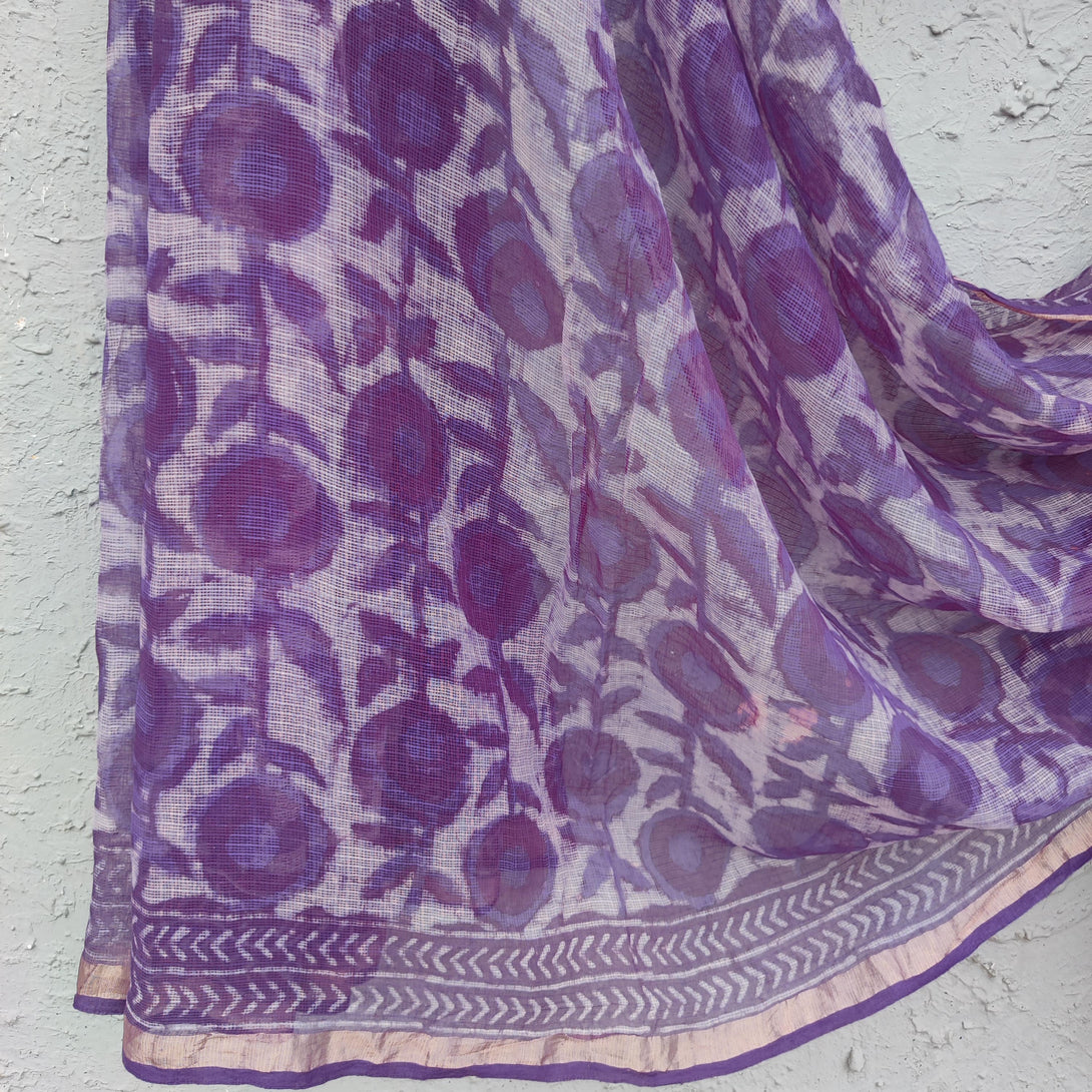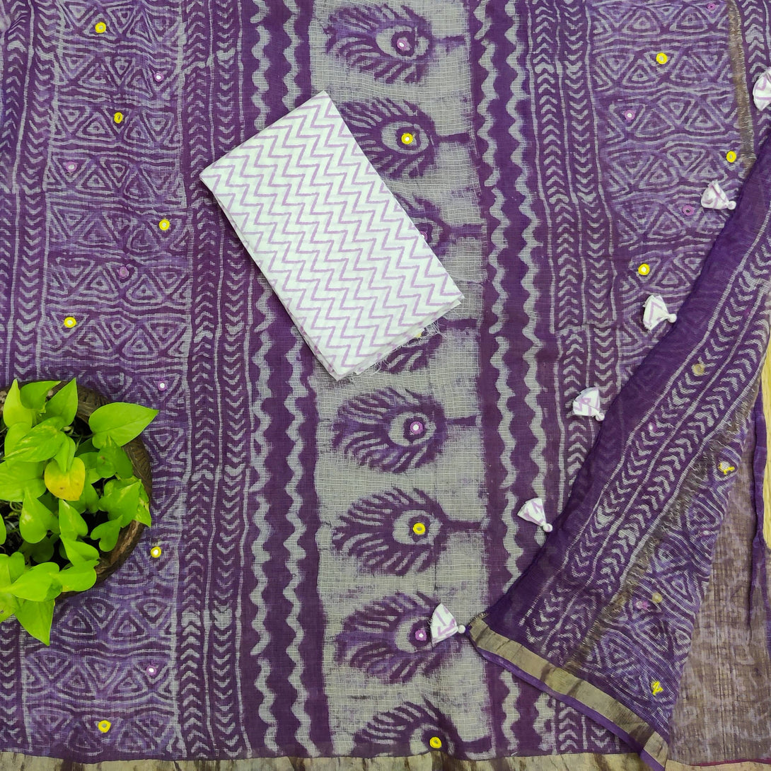 KOTA QUEEN - Pure Cotton Kota Saree With Mirror Embellished Pallu And A Contrast Blouse Purple Saree With White And Purple Blouse