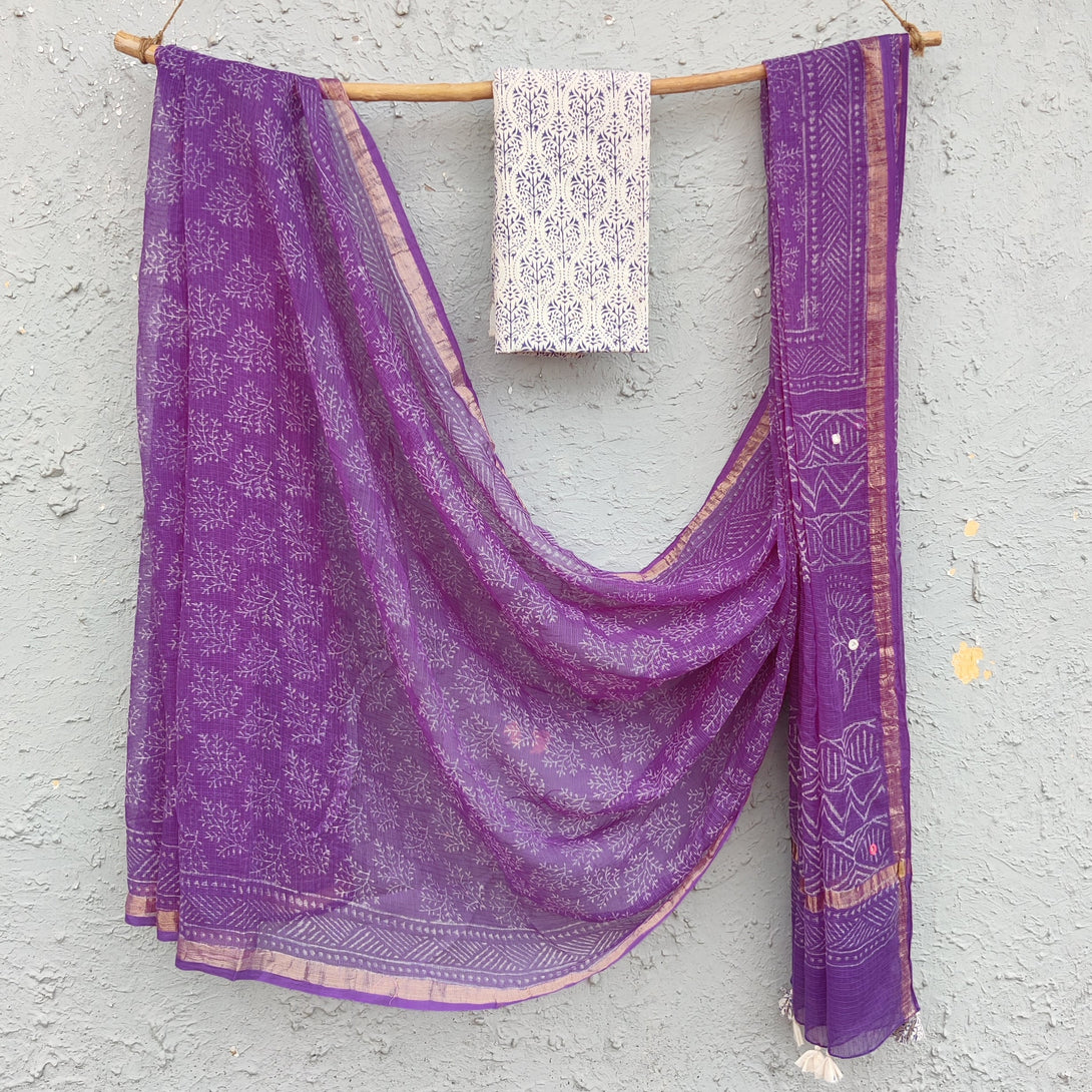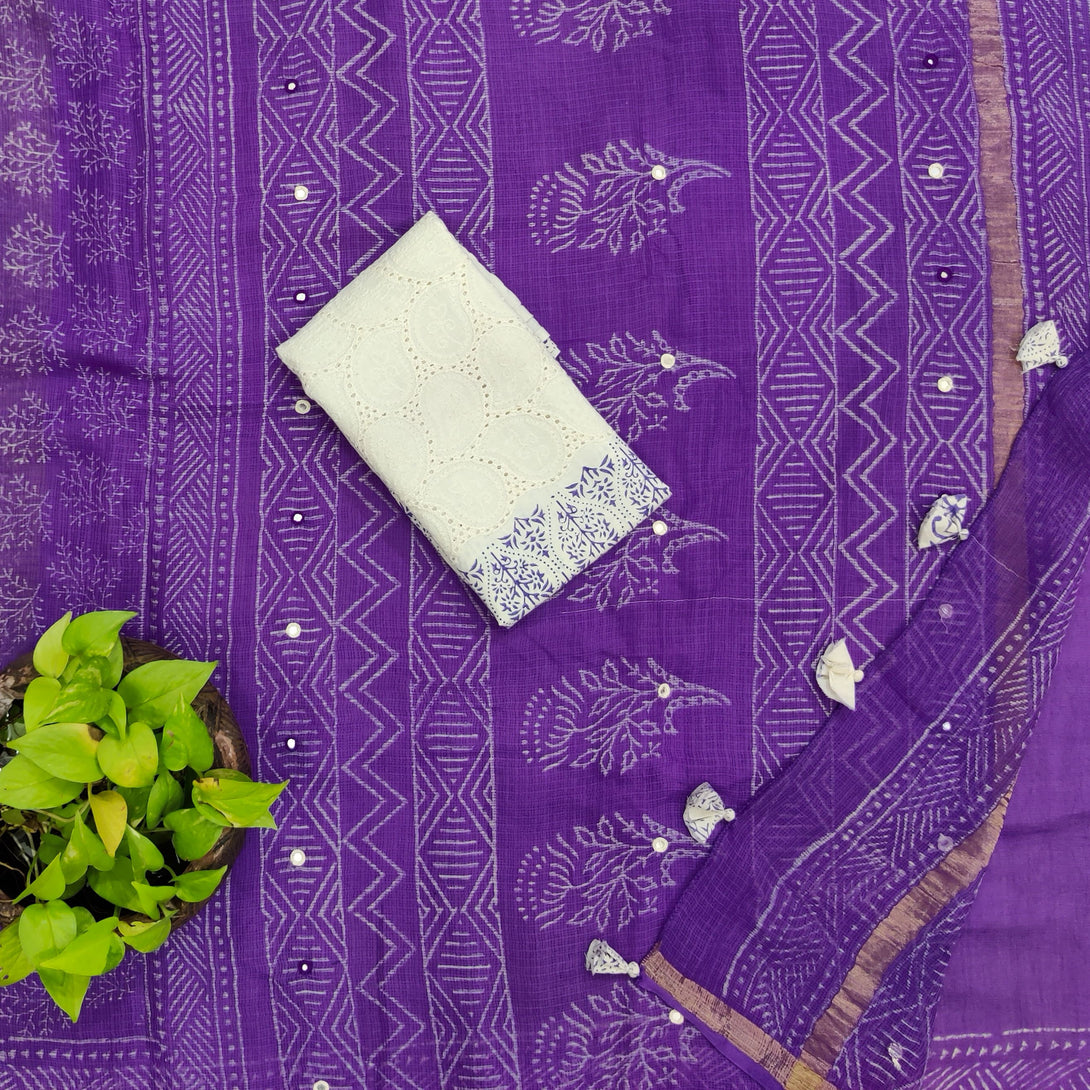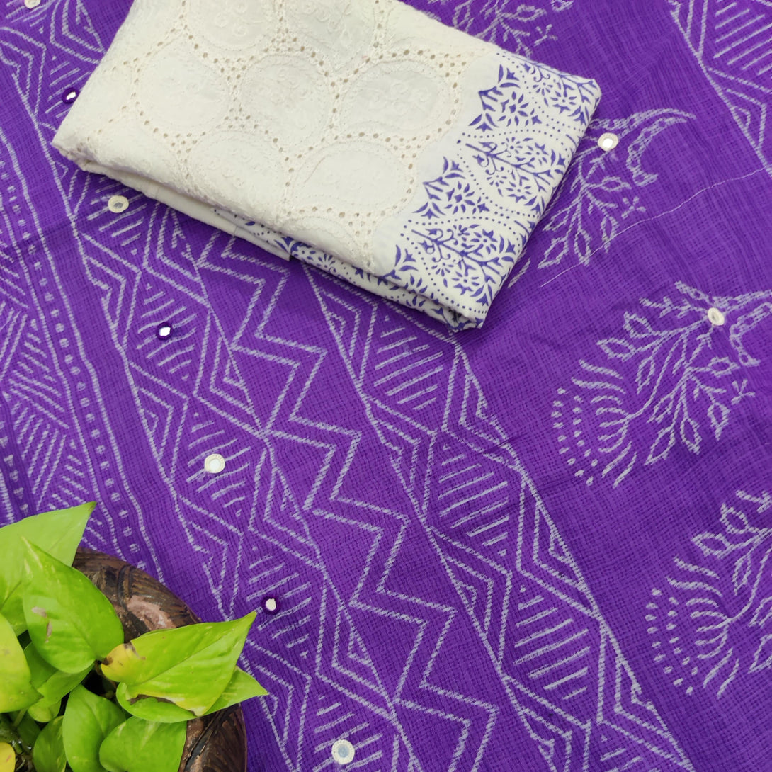 KOTA QUEEN - Pure Cotton Kota Saree With Mirror Embellished Pallu And A Contrast Blouse Purple With Hakoba Printed Blouse