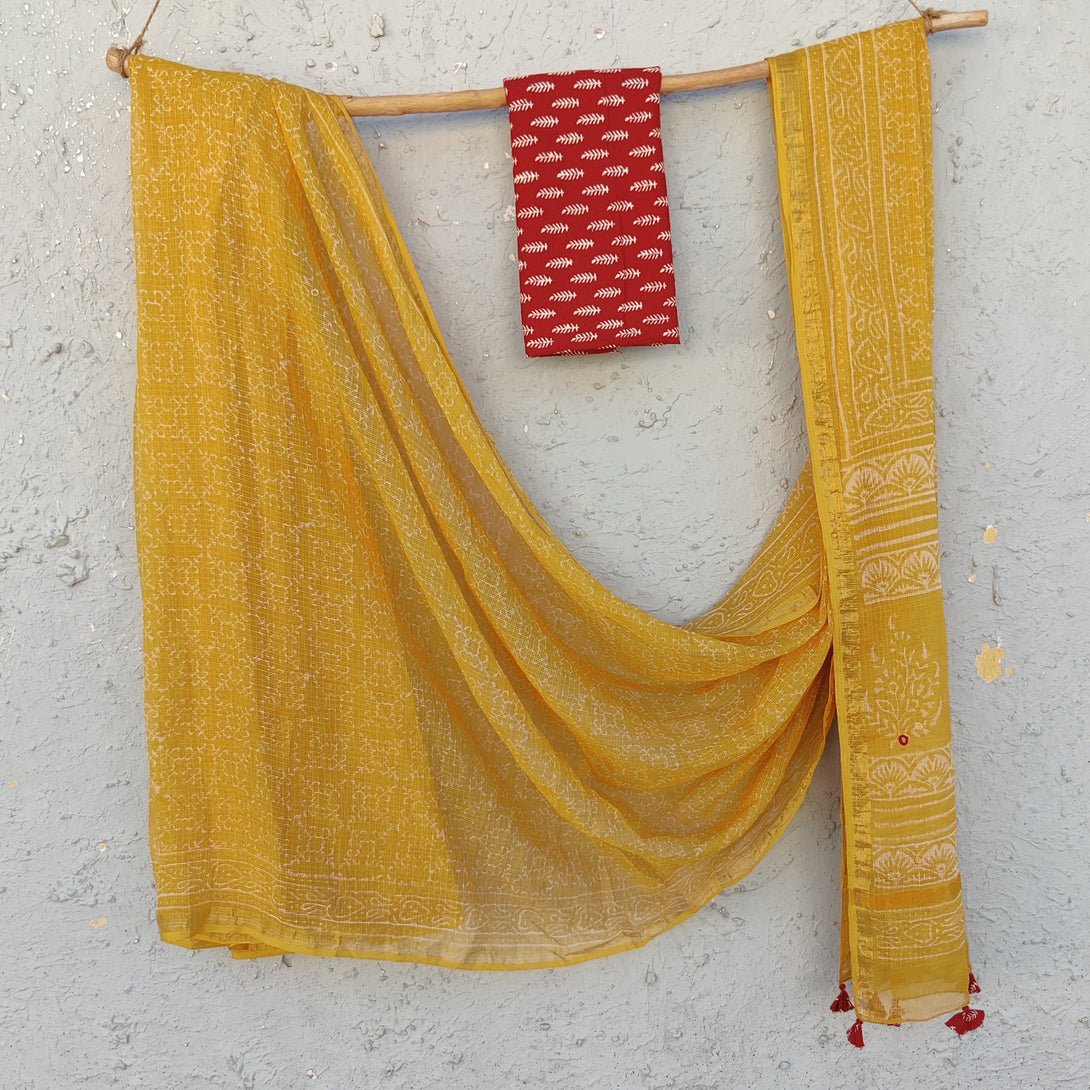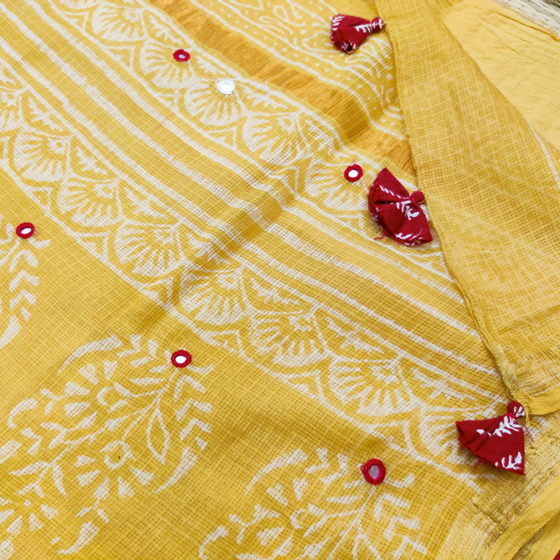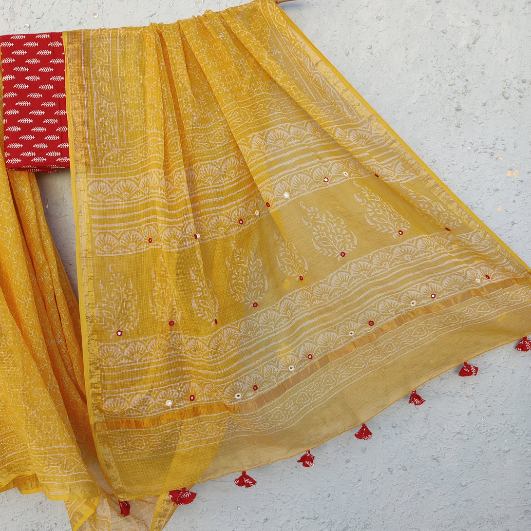 KOTA QUEEN - Pure Cotton Kota Saree With Mirror Embellished Pallu And A Contrast Blouse Yellow With Red Blouse