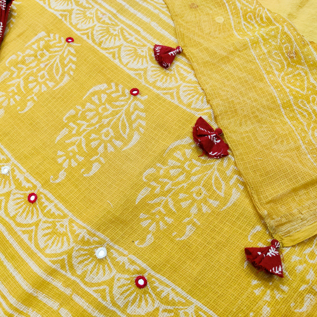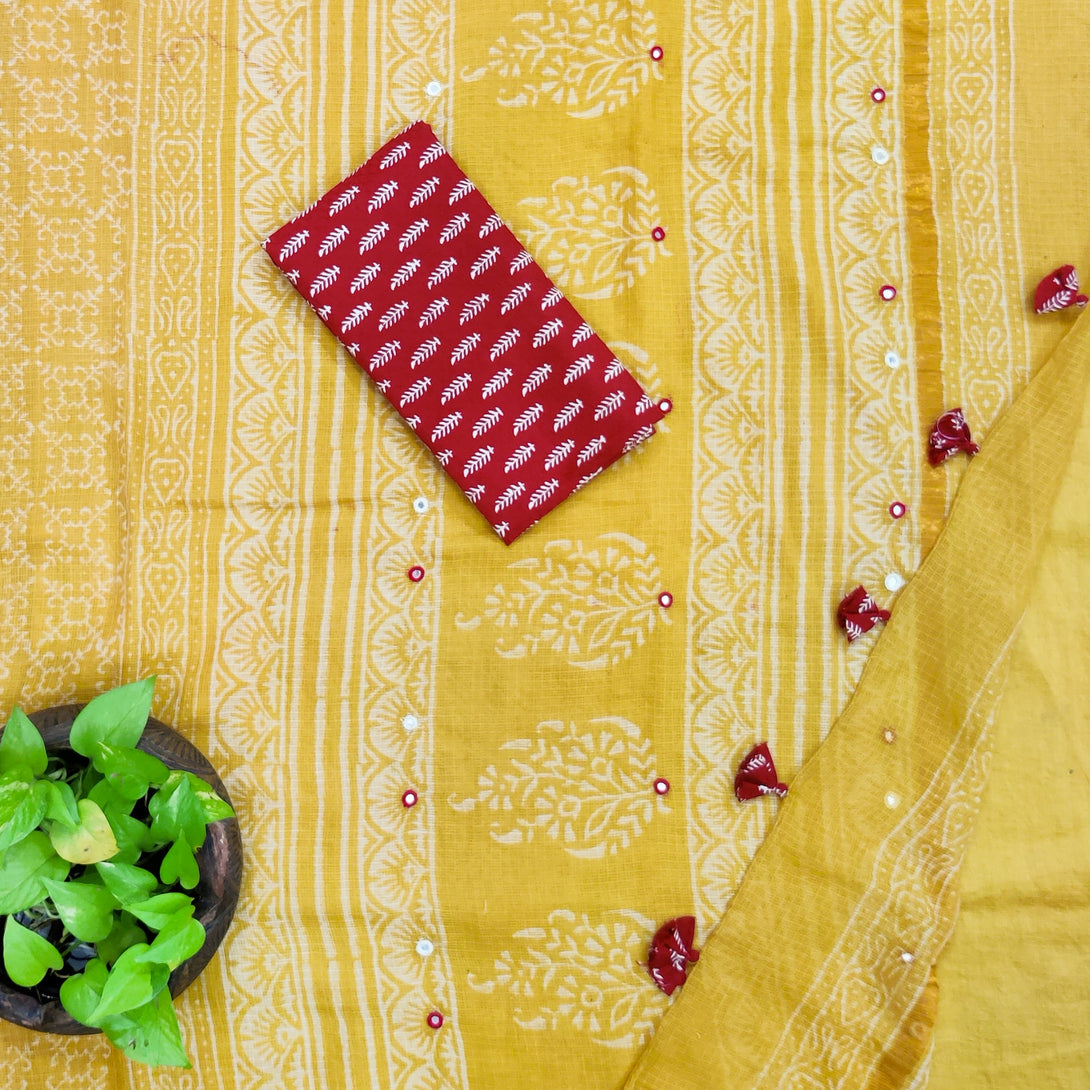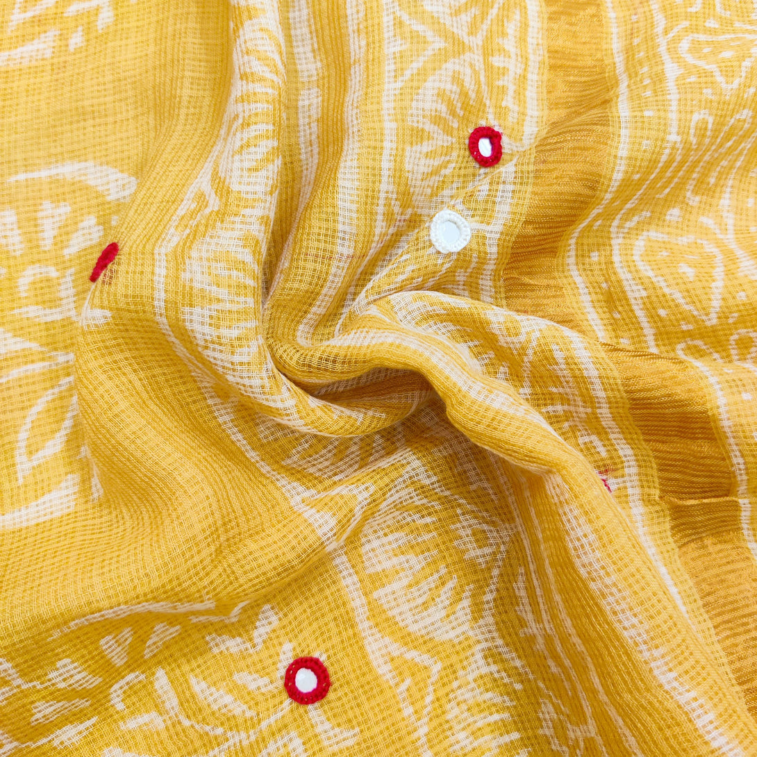 KOTA QUEEN - Pure Cotton Kota Saree With Mirror Embellished Pallu And A Contrast Blouse Yellow With Red Blouse