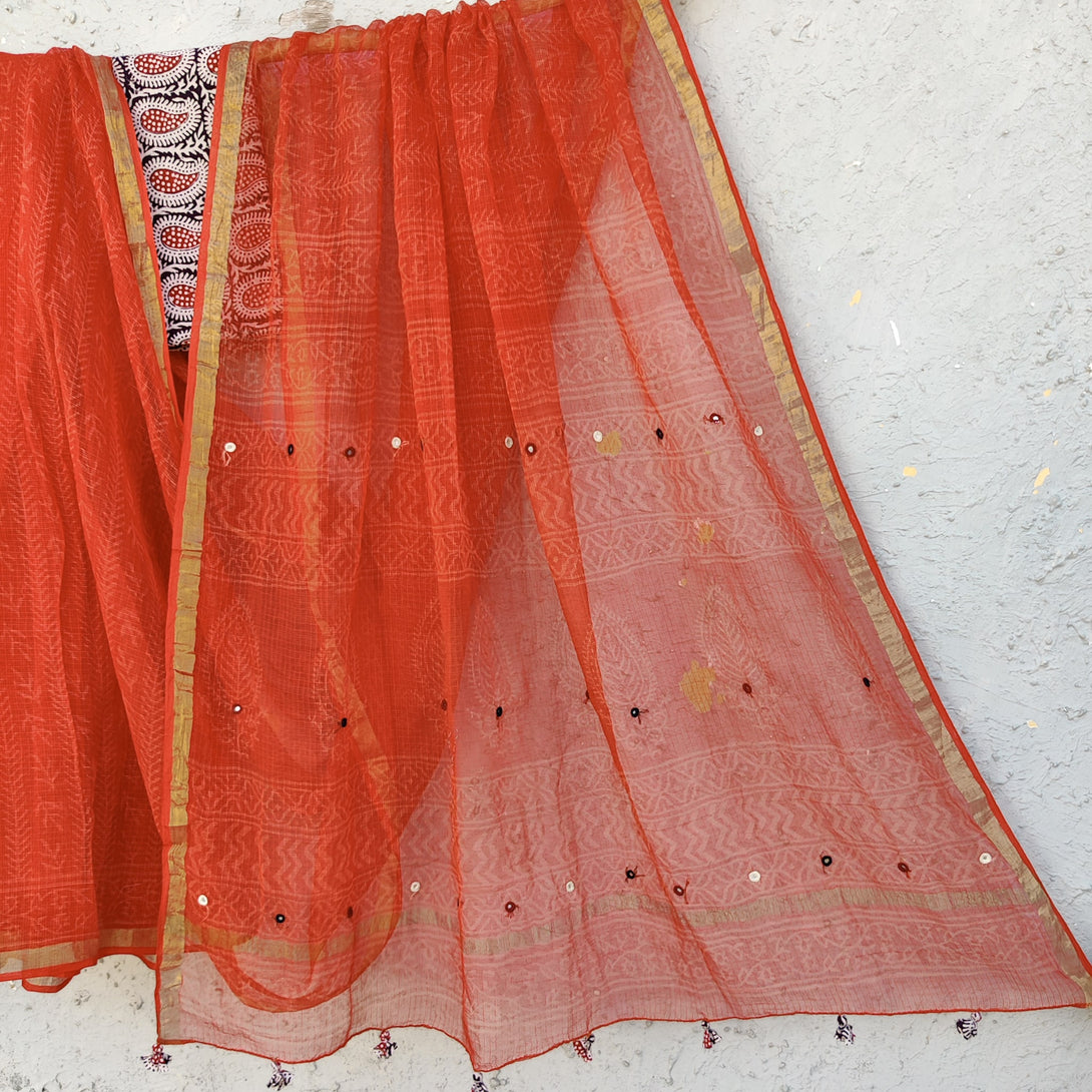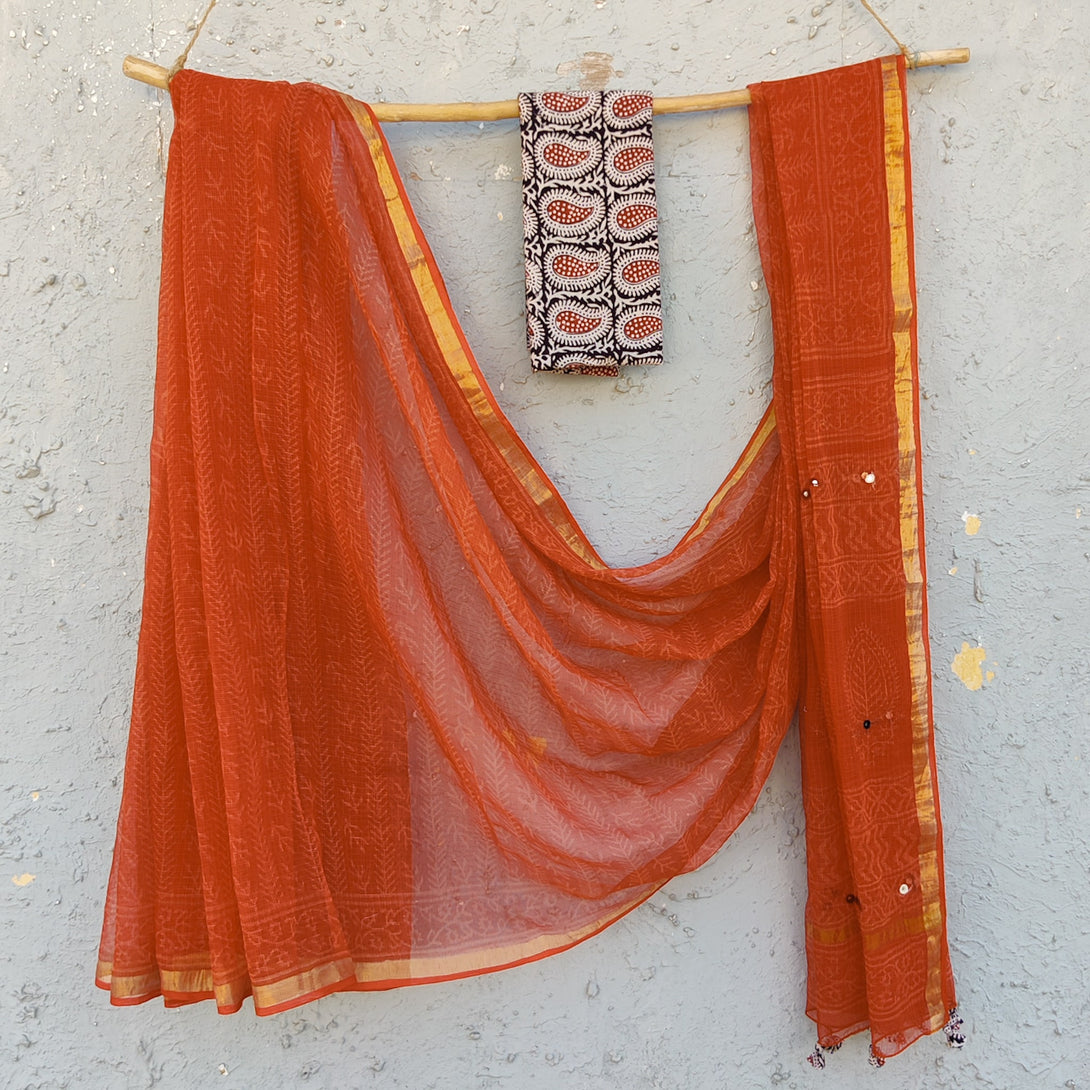 KOTA QUEEN - Pure Cotton Kota With Mirror Embellished Pallu And A Contrast Blouse Rust Orange With Bagh Blouse