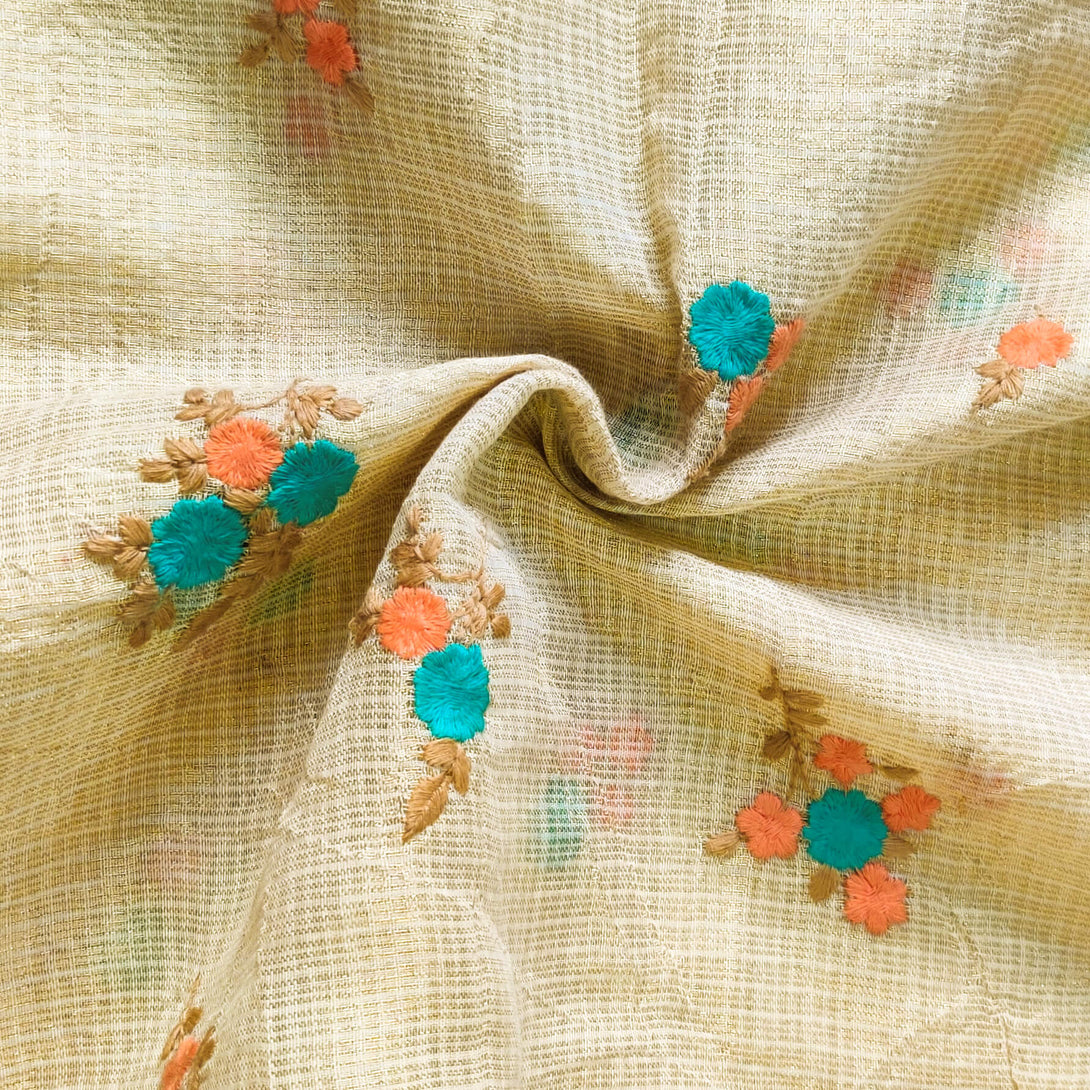 Kota Silk Light Gold With Blue And Peach Tiny Bunch Of Flowers Embroidered Fabric