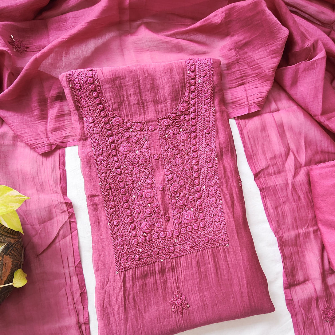Lucknowi -Mul Chandari Lucknowi Dark Onion Pink With Embroided Yoke Suit