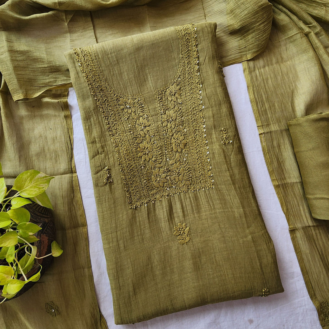 Lucknowi -Mul Chandari Lucknowi Mehandi Green With Embroided Yoke Suit