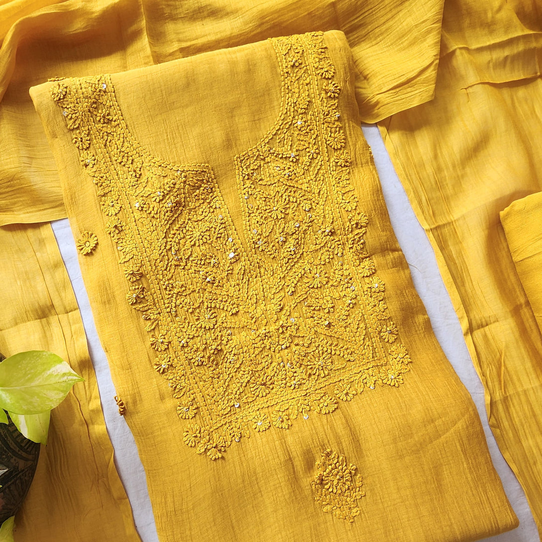 Lucknowi -Mul Chandari Lucknowi Mustard With Embroided Yoke Suit