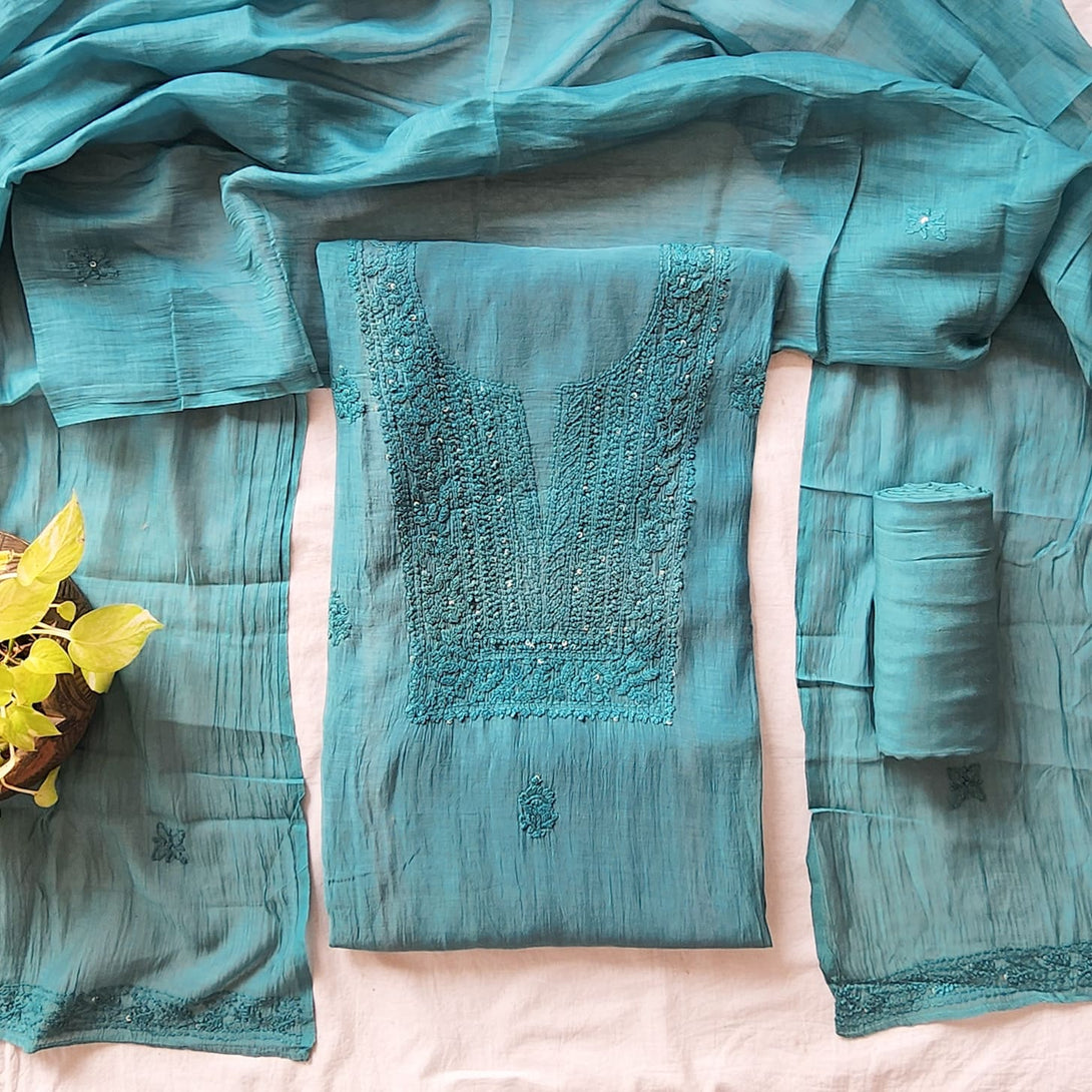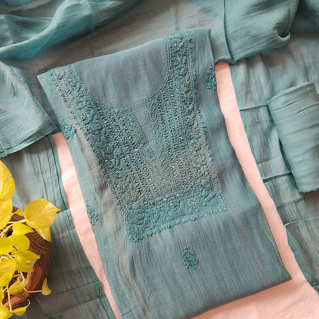 Lucknowi -Mul Chandari Lucknowi Teal With Embroided Yoke Suit
