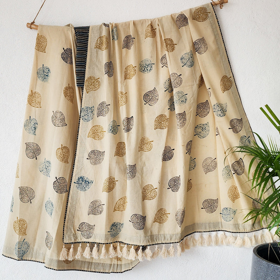 MADHU-Pure Cotton Ajrak Cream With Leaves Hand Block Printed Saree
