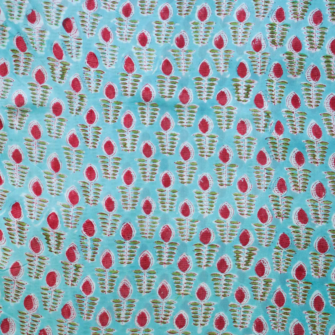 Modal Cotton Jaipuri Light Blue With Pink Flower Bud Motifs Hand Block Print Fabric