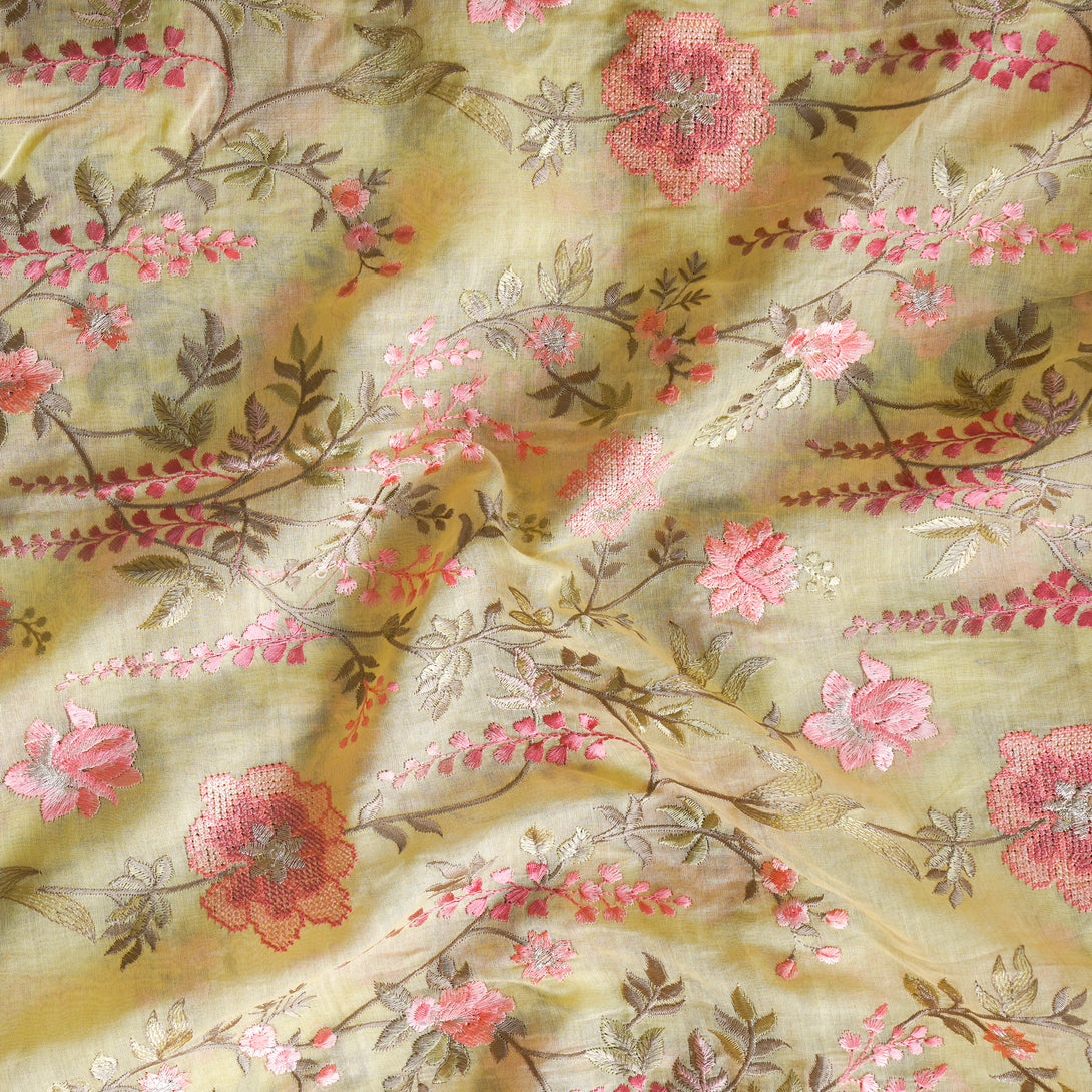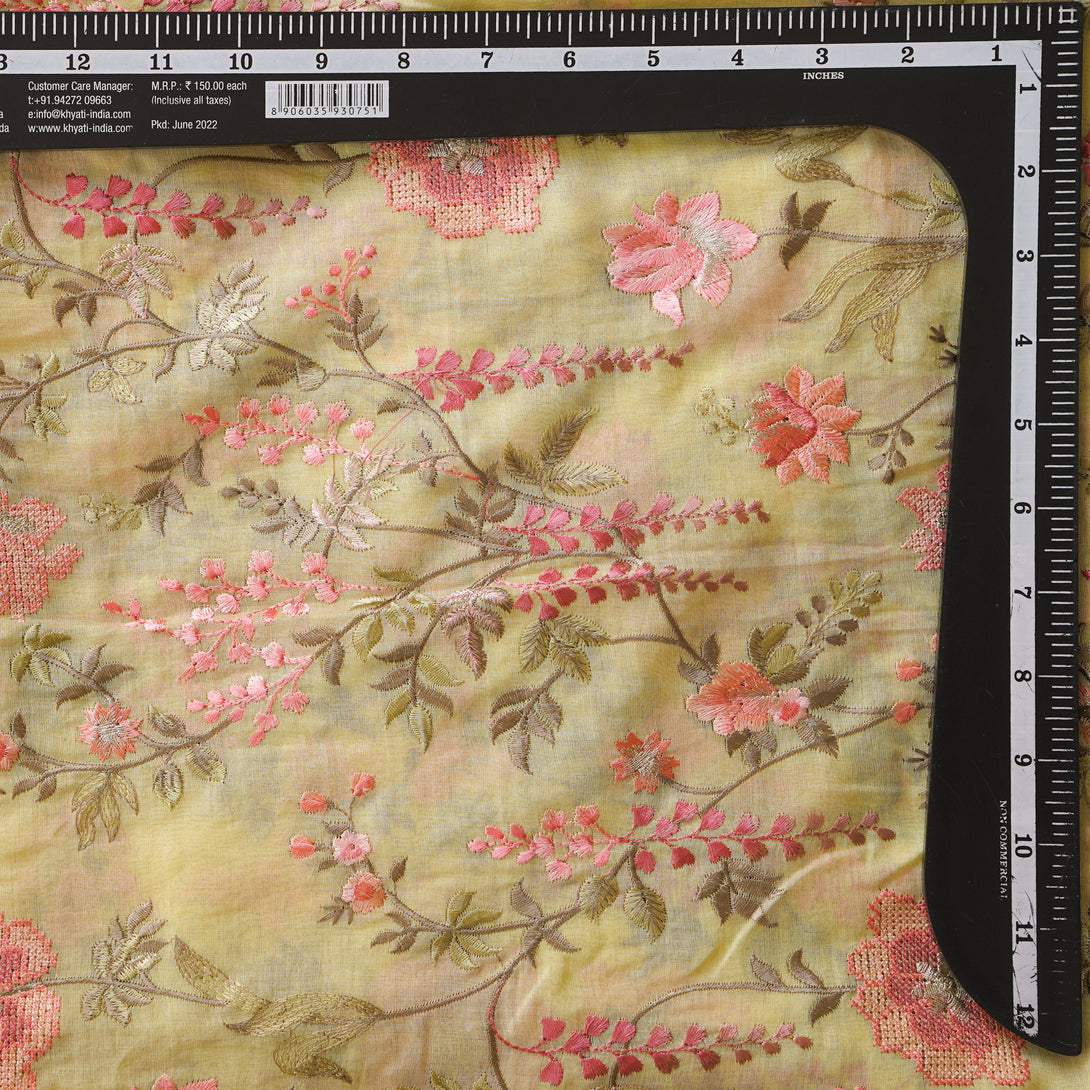 Mul Chanderi Pastel Yellow With Flower Jaal Embroidery Fabric